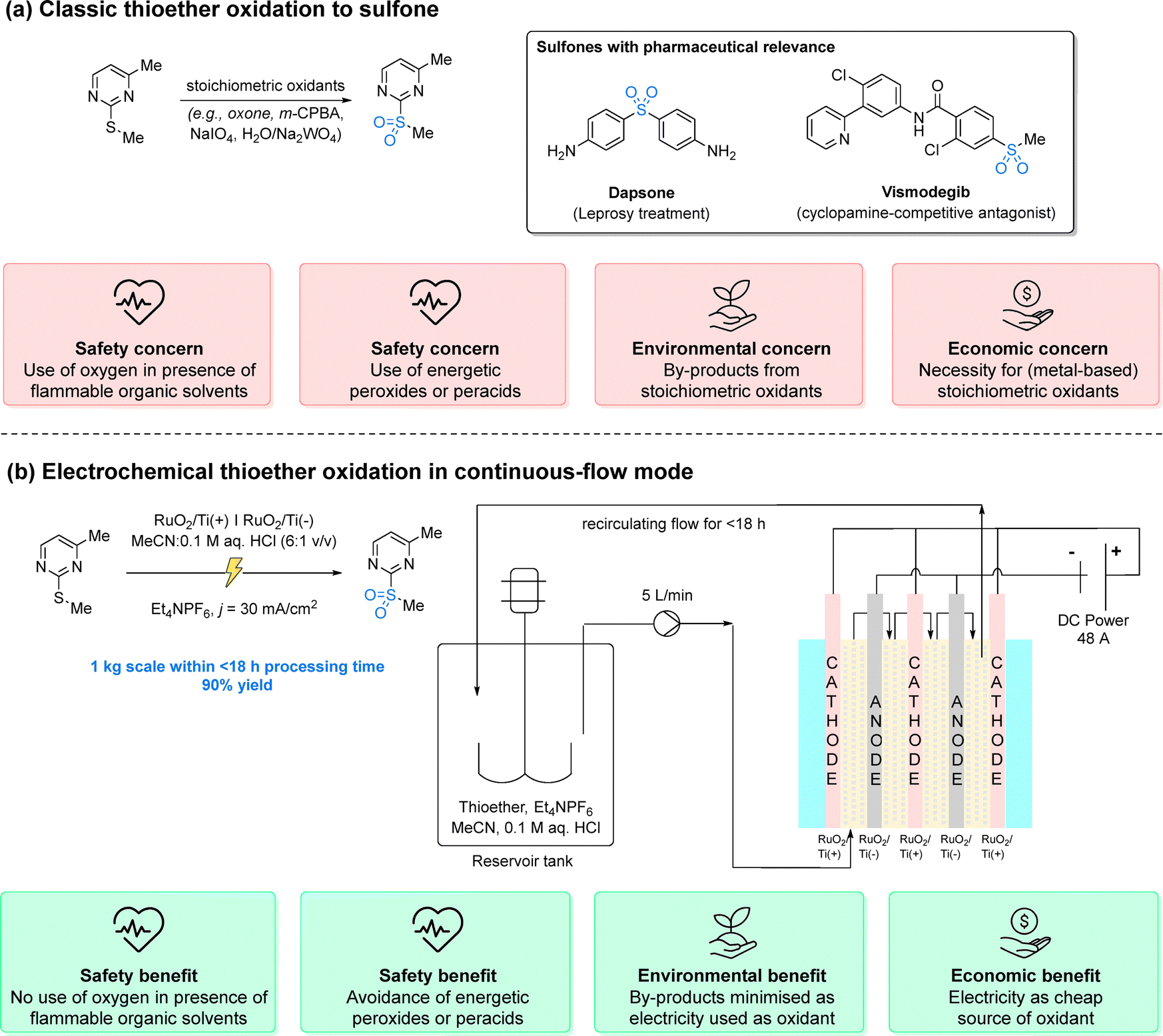 | Scheme 29 Batch vs. continuous-flow approach for thioether oxidation. The traditional methods (a) rely on oxygen, peroxides, or metal-based oxidants to obtain the sulfone, leading to safety risks, hazardous byproducts, and higher costs. The continuous-flow electrochemical approach (b) replaces these reagents with electricity as the oxidant, eliminating energetic peroxides, minimizing waste, and avoiding flammable oxygen–solvent mixtures. Adapted from ref. 450. | ||