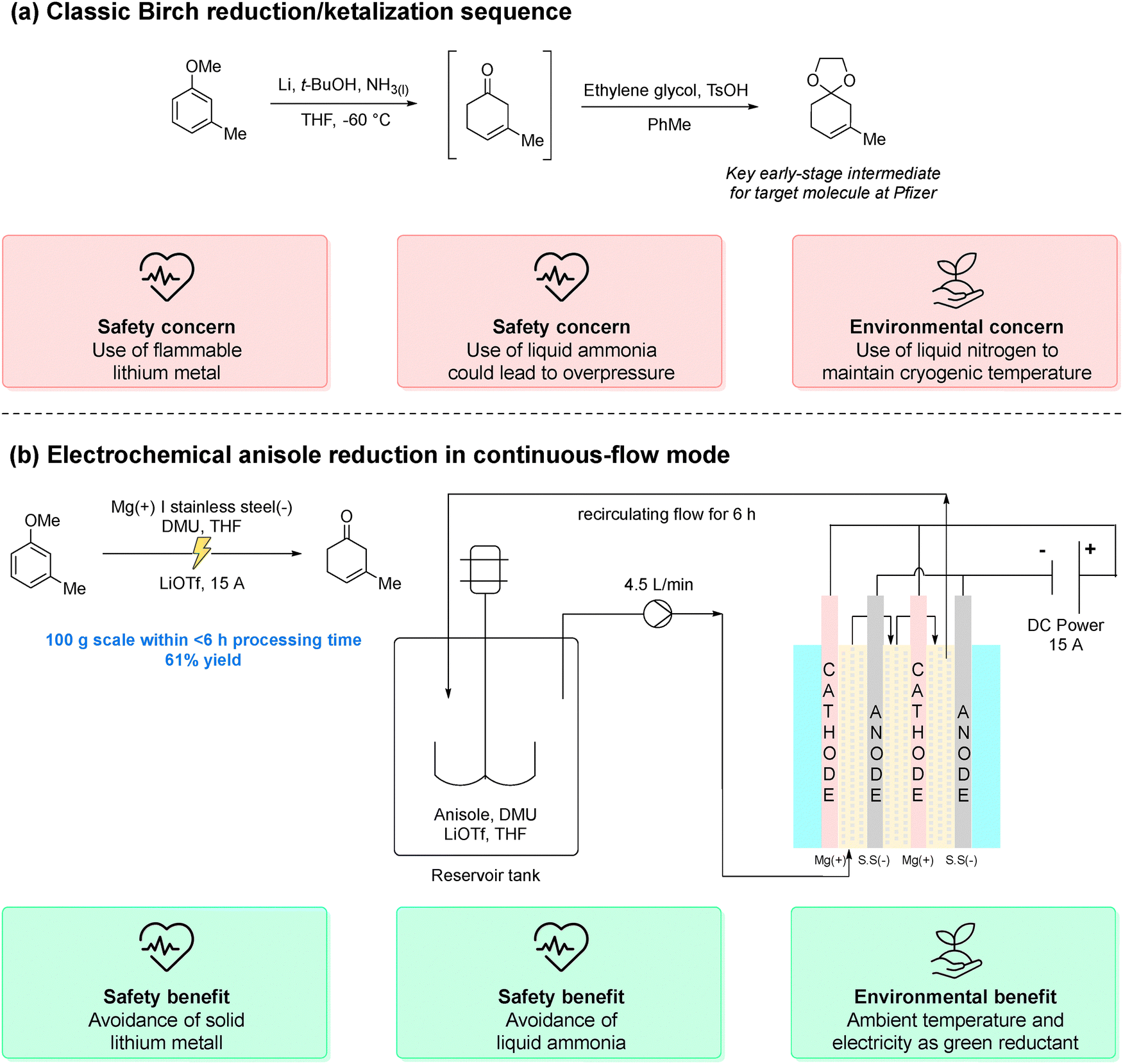 A similar workflow was recently adopted at Pfizer as a safer and more scalable route to ketal 14 (Scheme 30).451 In the original linear batch route, a telescoped Birch reduction/ketalization of anisole 12 afforded ketal 14 in 74% yield in batches exceeding 50 kg. However, this approach entailed using flammable lithium metal (7.2 kg per batch) and large quantities of liquid ammonia (210 kg per batch) raising concerns about overpressure hazards as well as the economic and environmental costs of maintaining cryogenic conditions (−50 °C to −60 °C). Furthermore, the process was labor-intensive, necessitating multiple lithium additions to control exotherms, meticulous drying to prevent moisture-sensitive decomposition of ketone 13, and the use of several vessels for reaction and work-up.