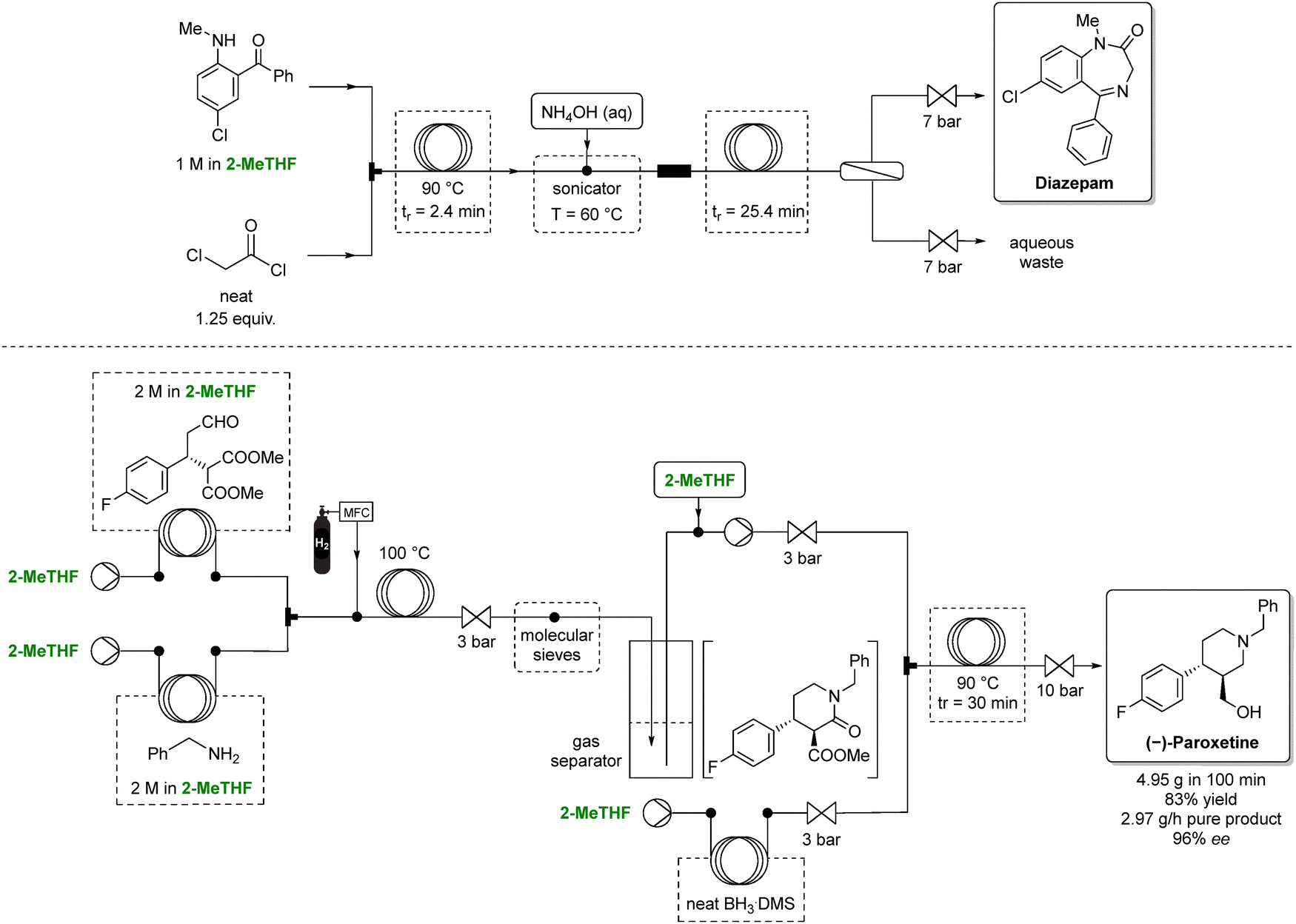 To address these inefficiencies, continuous-flow processing is emerging as a transformative approach for the fine chemical sector. Continuous-flow processes involve continuously pumping reagents into a plug flow reactor (PFR) or mixed reactors [e.g., continuous-stirred tank reactor (CSTR)], from which product is continuously discharged. This transforms productivity metrics from measurements of unit time (temporally) to ones of unit space (spatially) as product amounts can be simply scaled up by prolonged operation.32,410 Beyond minimizing hold and processing times, flow reactors enable multiple synthetic steps to be consolidated within a single continuous run—a strategy known as multistep flow synthesis (Fig. 11, bottom).32,410 Conducting reactions in miniaturized continuous-flow reactors confers additional advantages.411–414 From a safety perspective, flow reactors offer steady-state operations, which can reduce the frequency of start-up and shutdown cycles. This feature can help limit the immediate consequences of process deviations. However, it is important to note that hazardous or toxic reagents are still present in the overall system, often in similar or greater quantities than in batch, and while their instantaneous inventory within the reactor is typically lower than in batch setups, appropriate precautions remain essential during reagent handling, charging, and storage. In addition, superior mixing and heat transfer mitigate the risk of thermal runaway, particularly in miniaturized flow systems. In some cases, reactive intermediates that are unstable in batch can be generated and used in situ in flow, without the need for isolation. Furthermore, greater control over key reaction parameters (temperature, pressure, and residence time) is one of the defining advantages of flow systems. This control can allow access to more extreme or highly precise conditions that may be challenging to achieve safely in batch, enabling reactions that require elevated temperatures, pressures, or rapid quenching.415–417 Flow methods are also increasingly integrated with advanced digitization and in-line Process Analytical Technology (PAT), such as real-time IR, NMR, UV-VIS, or UHPLC.418 These technologies support reaction monitoring, kinetic analysis, self-optimization, and dynamic experimentation, contributing to greater process understanding and control.419–422 That said, the implementation of flow methods does not automatically guarantee a greener process. In some cases, flow systems may require more dilute conditions to maintain solubility, which can negatively impact the PMI unless effective solvent recovery strategies are in place. On the other hand, the ability to heat or cool smaller reaction volumes more efficiently can offer energy savings and tighter thermal control, particularly for reactions that benefit from either precise or extreme conditions.