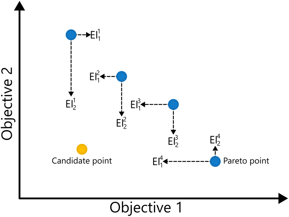 As mentioned before, several acquisition functions have been developed for single-objective Bayesian optimization.18 Here, four widely used acquisition functions will be discussed: expected improvement, probability of improvement, upper confidence bound, and Thompson sampling. Each of these functions uses the predictions and uncertainty provided by the surrogate model to calculate a scalar utility value for a potential sampling point.