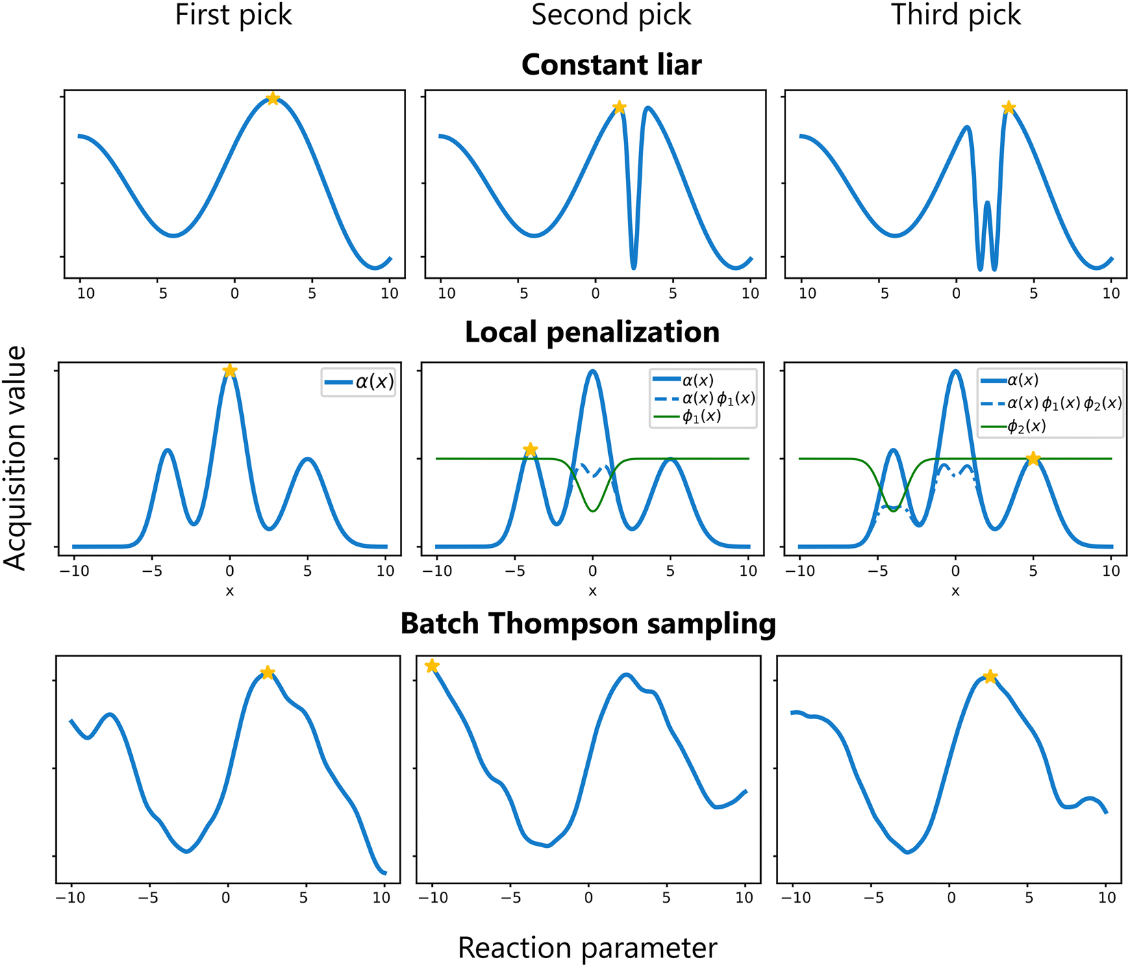 Several different acquisition functions exist.17,18 Common acquisition functions include Expected Improvement (EI), Probability of improvement (PI), Upper Confidence Bound (UCB), and Thompson Sampling (TS). Each of these functions embodies a different strategy for navigating the exploration–exploitation trade-off, yet no single acquisition strategy provides superior performance over all problem instances.17 In practice, the optimal choice of the acquisition function depends on the problem. A comparison of selected acquisition functions is provided in Fig. 7.