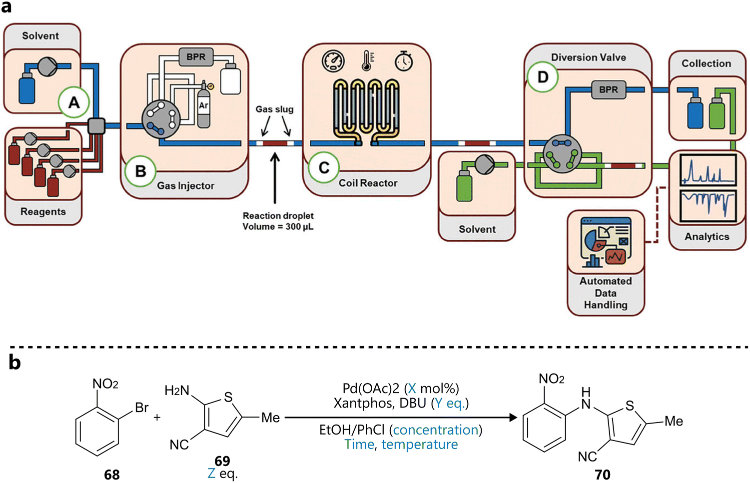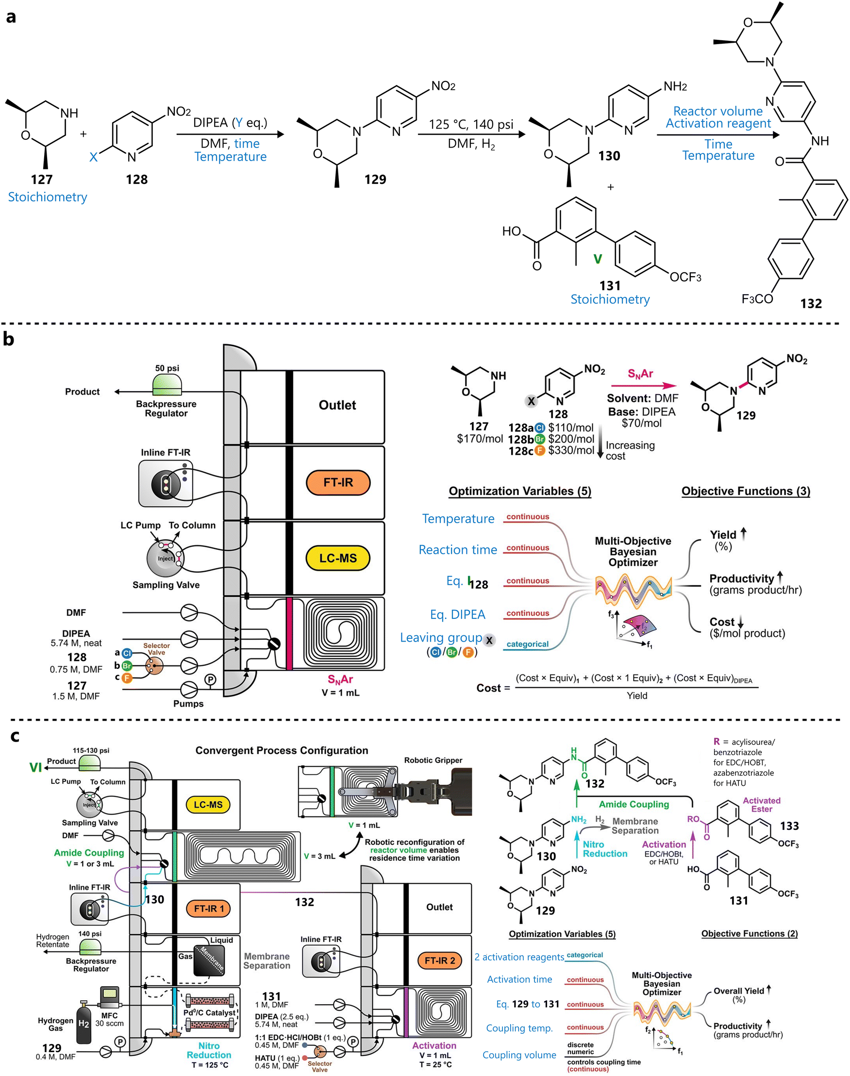 For the multistep downstream optimization—comprising nitro reduction, gas–liquid separation, and amide coupling—the platform was reconfigured into a convergent layout, in which the carboxylic acid 131 was first pre-activated upstream before being contacted with the amine, reducing side-reactions with the coupling agent that were observed during the preliminary telescoped experiments (Fig. 22c). The BO campaign considered five variables: activation reagent (categorical), equivalents of nitro compound, activation time, coupling temperature, and reactor volume (1 or 3 mL). The latter was varied on-the-fly via robotic reconfiguration to access different residence times without altering upstream flow rates. Two objectives, yield and productivity, were optimized over fifteen experiments. Practical constraints meant that some parameters (e.g., solvent, concentration, temperature of the nitro reduction) were fixed. Inline FTIR provided real-time monitoring of reduction and activation steps, while LC-MS quantified product formation, enabling robust closed-loop optimization of the downstream sequence. The study exemplifies how BO, real-time process analytics, and modular hardware can be combined to provide efficient navigation of complex multistep chemical spaces, as well as showing the importance of sufficient understanding of the interdependencies in complex telescoped systems before starting optimization.