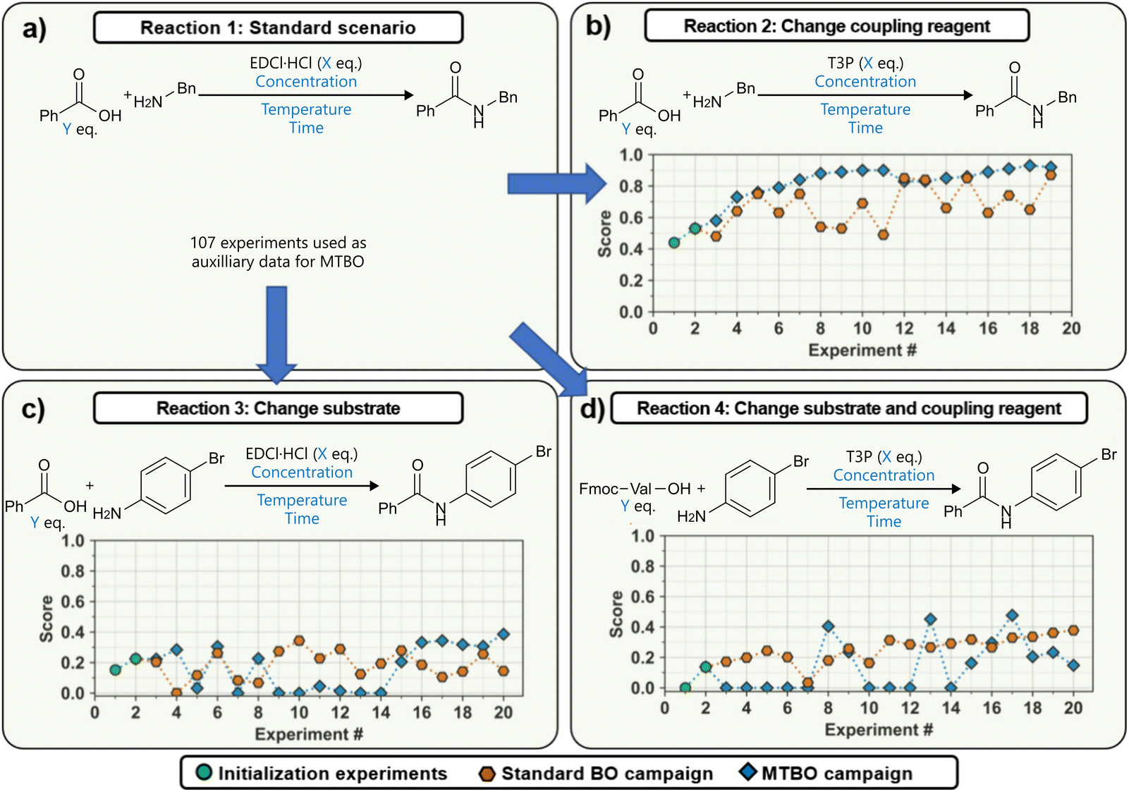 Finally, the potential for transferring knowledge across related optimization tasks was evaluated using multi-task Bayesian optimization (MTBO), a topic that will be discussed in more detail in Section 6. Three transfer scenarios were considered: (1) changing the coupling reagent, (2) changing the substrate, and (3) changing both. MTBO uses an auxiliary dataset performed on a related optimization task to try and improve optimization efficiency, in this case all 107 experiments that were previously carried out on the model reaction. While faster convergence was observed in the first case (new coupling reagent), no clear advantage was found for the more challenging substrate-related scenarios (Fig. 15b–d). Notably, these comparisons were performed with a small initialization set of only two experiments, so it could be argued that, with a proper initialization set, results may differ.