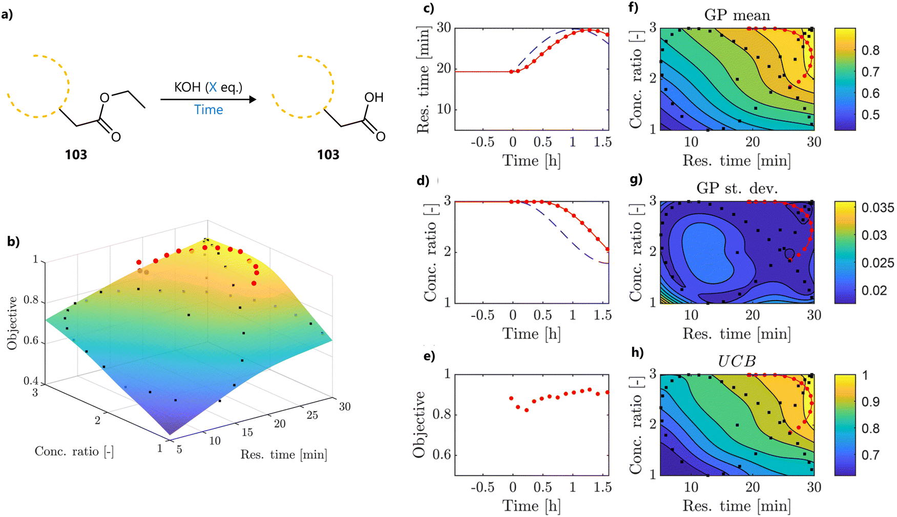 As an experimental validation, the method was applied to the optimization of an ester hydrolysis using an automated flow platform (Fig. 16), varying residence time and equivalents of base. The optimal region in this simple search space was identified after only two trajectories, one initial and one suggested by the algorithm. While it should be noted, however, that the identified optima were not validated using steady-state experiments, this study does demonstrate the potential of dynamic BO to reduce experimental burden while maintaining robust optimization performance.