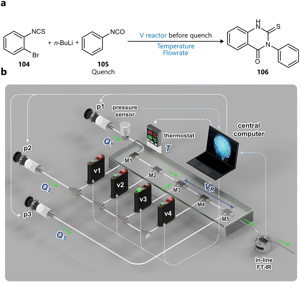 This was exemplified in the work by Ahn et al., who developed an automated microreactor platform for the optimization of ultrafast organolithium chemistry.117 The synthesis of thioquinazolinone 106 via the intramolecular cyclization of an in situ generated isothiocyanate-bearing aryllithium intermediate with an isocyanate was optimized using a BO framework with GP surrogate an EI acquisition function with real-time feedback from inline IR spectroscopy (Fig. 17). Unusually, reactor volume was included as an optimization variable alongside flow rate and temperature, by controlling solenoid valves that varied the point of injection of the organolithium reagent along the temperature-controlled reactor. Notably, the flow rate ratio between reagents was held constant, even though this could have been an interesting parameter given the mixing-sensitive nature of the transformation. The three-variable BO campaign was repeated five times, each converging within ten experiments and outperforming a DoE design with 80 experiments in ±80% of cases. The authors also benchmarked against random sampling, which performed significantly worse. In a subsequent campaign, the organolithium reagent (three levels) was added as a categorical variable and optimized in 15 experiments, resulting in a slight improvement in yield. These optimized conditions were then used for the combinatorial synthesis of nine S-benzylic thioquinazolinone derivatives.