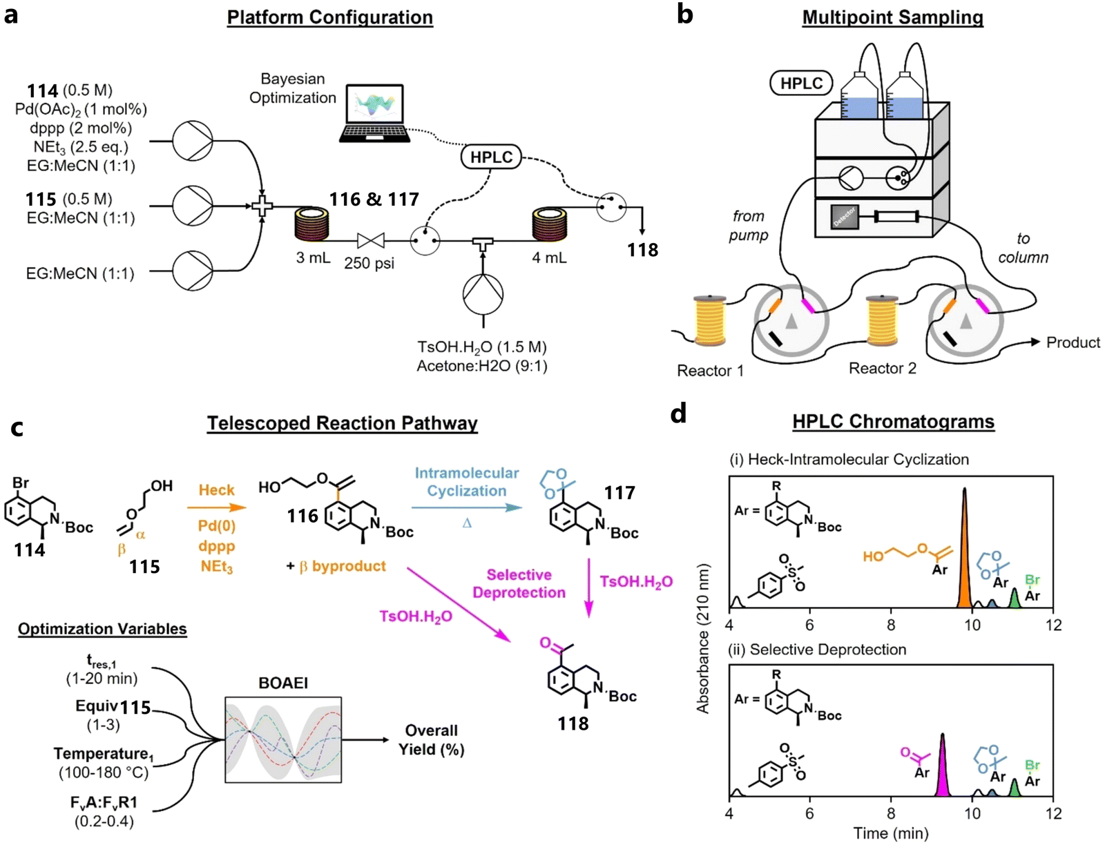Going a step further, Clayton et al. demonstrated how multi-point sampling within a telescoped flow system can enhance overall process understanding and guide Bayesian optimization towards more effective global optima.55 The studied reaction sequence involved a Heck coupling optionally followed by intramolecular cyclization in the first reactor, and an acid-catalysed selective deprotection in the second (Fig. 19). The deprotection could proceed from either the intermediate coupling product or the cyclized product, but multi-point analysis revealed that deprotection from the former—contrary to prior expectations—led to better overall yield and lower equivalents of acid. Four variables were included in the optimization: the residence time in the first reactor, the equivalents of ethylene glycol, the temperature of the first reactor, and the ratio of the acid flow rate to the flow rate from the first reactor. The BO algorithm consisted of a GP surrogate and the adaptive expected improvement acquisition function. Importantly, the fully automated flow platform incorporated online HPLC sampling at both reactor outlets, enabling spatially resolved data acquisition and allowing for a deeper understanding of the process. Additionally, the authors noted that had the steps been optimized sequentially, the first step would likely have been driven to maximize the yield of the cyclized product, inadvertently compromising the overall process. Instead, holistic optimization of the total system using BO afforded superior performance for the telescoped sequence.