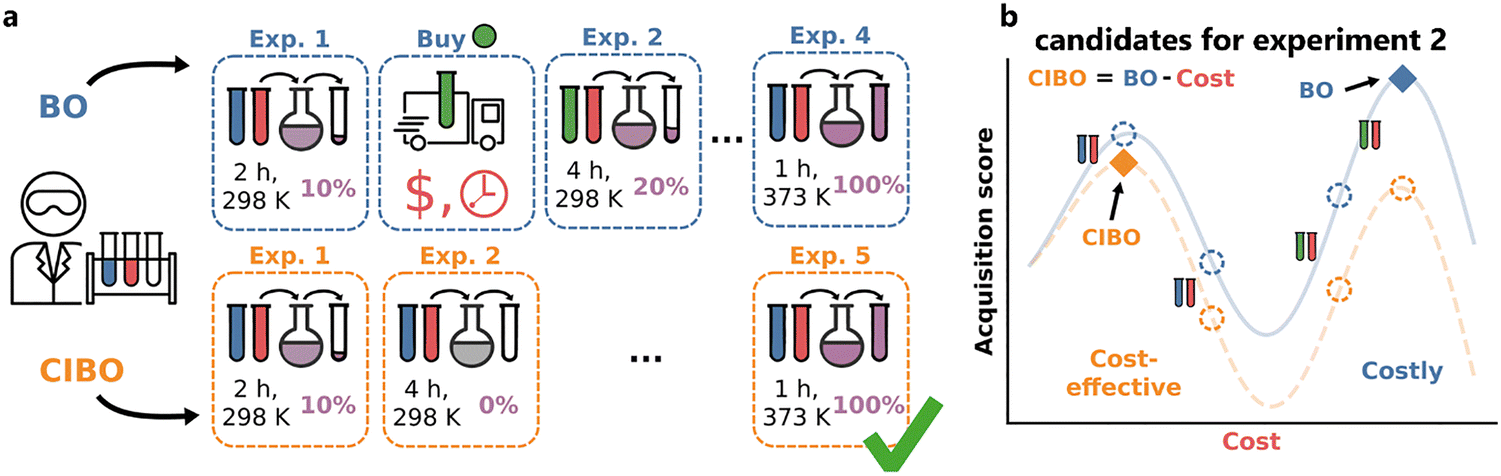 | Fig. 24 Comparison between standard and cost-informed BO (CIBO). (a and b) CIBO balances the expected improvement of the experiment with its cost, suggesting more cost-effective experiments. Adapted from Schoepfer et al.143 under a CC BY 3.0 Unported license.96 | ||