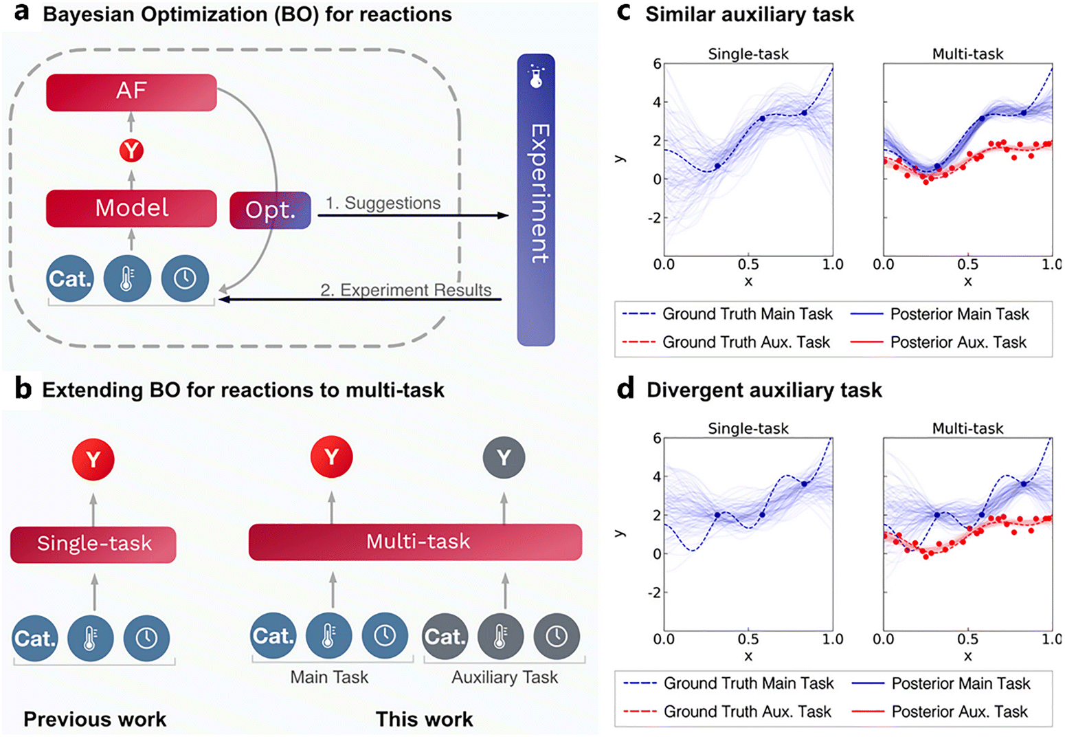 | Fig. 25 Multitask learning (MTBO) to accelerate Bayesian reaction optimization. (a) Standard BO. (b) Multitask BO replaces the GP with a multitask GP trained simultaneously on an auxiliary task (e.g. a similar chemical reaction). (c) When the auxiliary task is similar, predictions on the main task are greatly improved. (d) When the auxiliary task is divergent, performance is comparable to single-task BO. Adapted from Taylor et al.52 under a CC BY 4.0 license.97 | ||