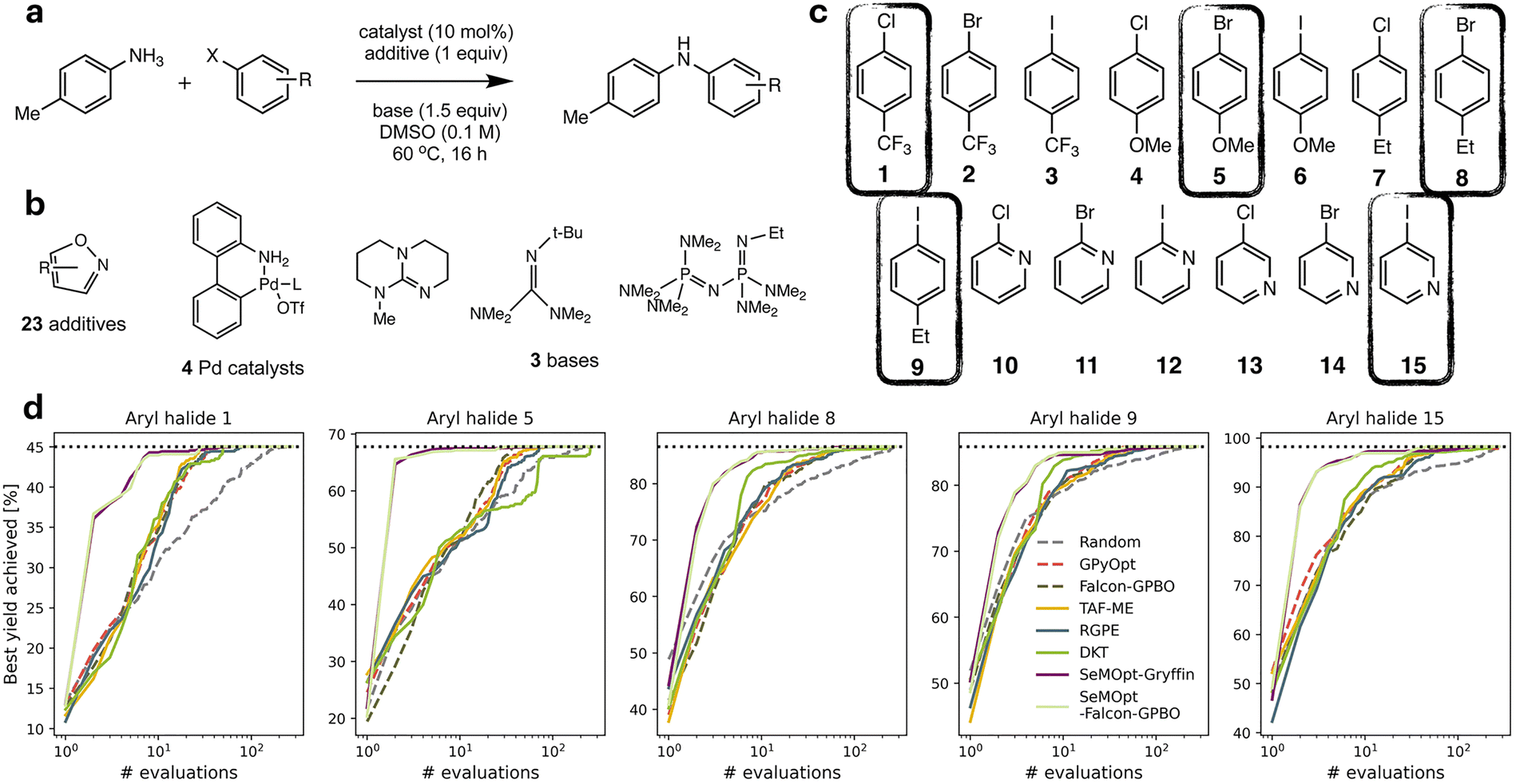 Hickman et al. introduced SeMOpt, a transfer learning framework for reaction optimization that incorporates prior experimental knowledge via a neural process (NP) model.145 Neural processes are a class of probabilistic models that learn a distribution over functions conditioned on data from previous tasks. In this context, the NP is trained on multiple completed optimization campaigns and used to predict likely high-performing regions of the design space for a new task. Rather than replacing the standard BO loop, SeMOpt blends the NP's prediction with that of a task-specific Gaussian process using a compound acquisition function—effectively biasing early search toward regions historically associated with high yields. As more task-specific data accumulate, the influence of the NP is gradually diminished, allowing the GP to take over. The framework was validated in silico using both a synthetic reaction family and a dataset of 15 Buchwald–Hartwig coupling campaigns derived from Ahneman et al.,146 each comprising 276 experiments spanning all possible parameter combinations for a given product (Fig. 26). While SeMOpt significantly reduced the number of experiments required to identify high-performing conditions, the authors note several limitations—such as the need for consistently encoded historical data, the sensitivity of transfer performance to task similarity, and challenges in representing categorical variables—which are not specific to SeMOpt but reflect broader obstacles in applying BO to chemical reaction optimization. Among the approaches surveyed in this section, SeMOpt stands out as the most formalized and modular transfer learning framework—offering explicit task conditioning, dynamic influence balancing, and a principled fallback to standard BO when prior data prove uninformative.