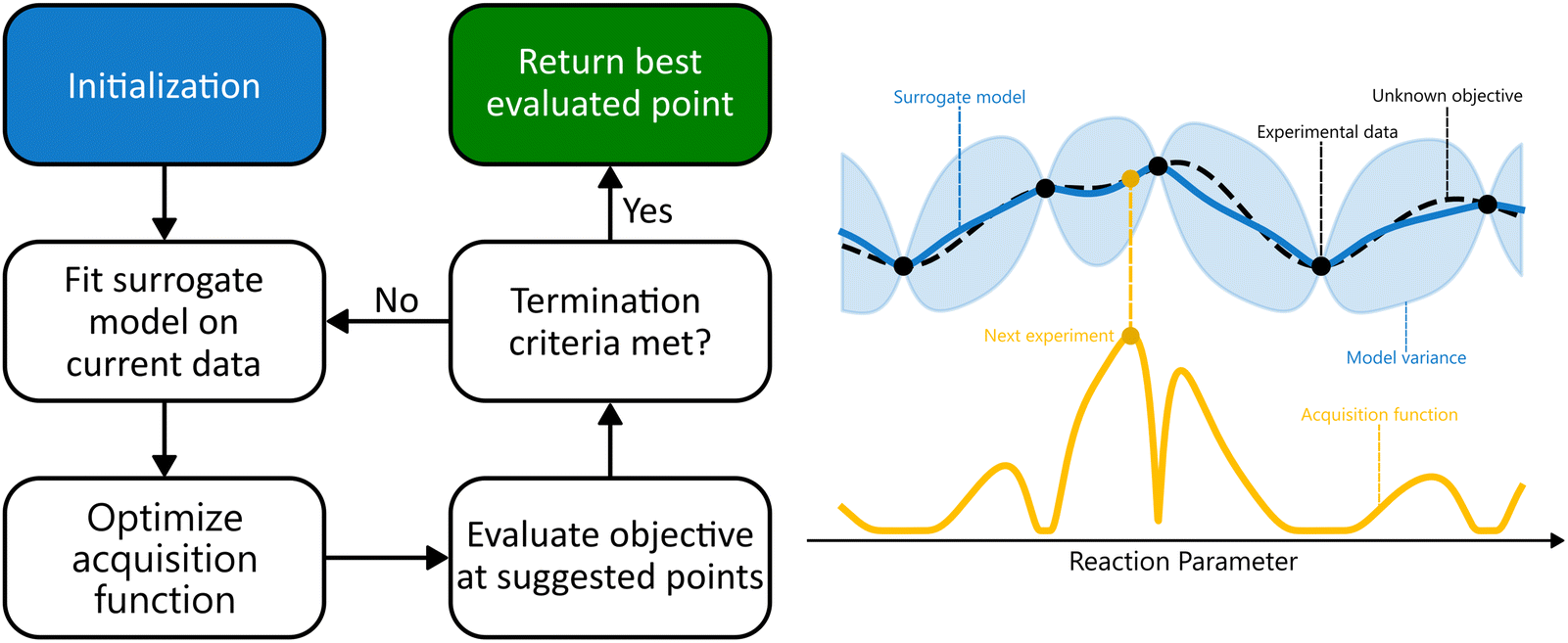 The optimization procedure starts with an initialization phase, where initial data is collected via an experimental design such as Latin Hypercube Sampling (LHS), a Design of Experiments (DoE), or even random sampling. Alternatively, existing reaction data can be used. These data are then used to fit a surrogate model, which incorporates a prior distribution that captures initial beliefs about the behaviour of the unknown objective function, such as smoothness or expected amplitude. As the initialization data is used to train the surrogate model, the prior distribution is updated, leading to a posterior distribution that improves the accuracy of the surrogate model in reflecting the objective function.17–19