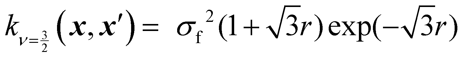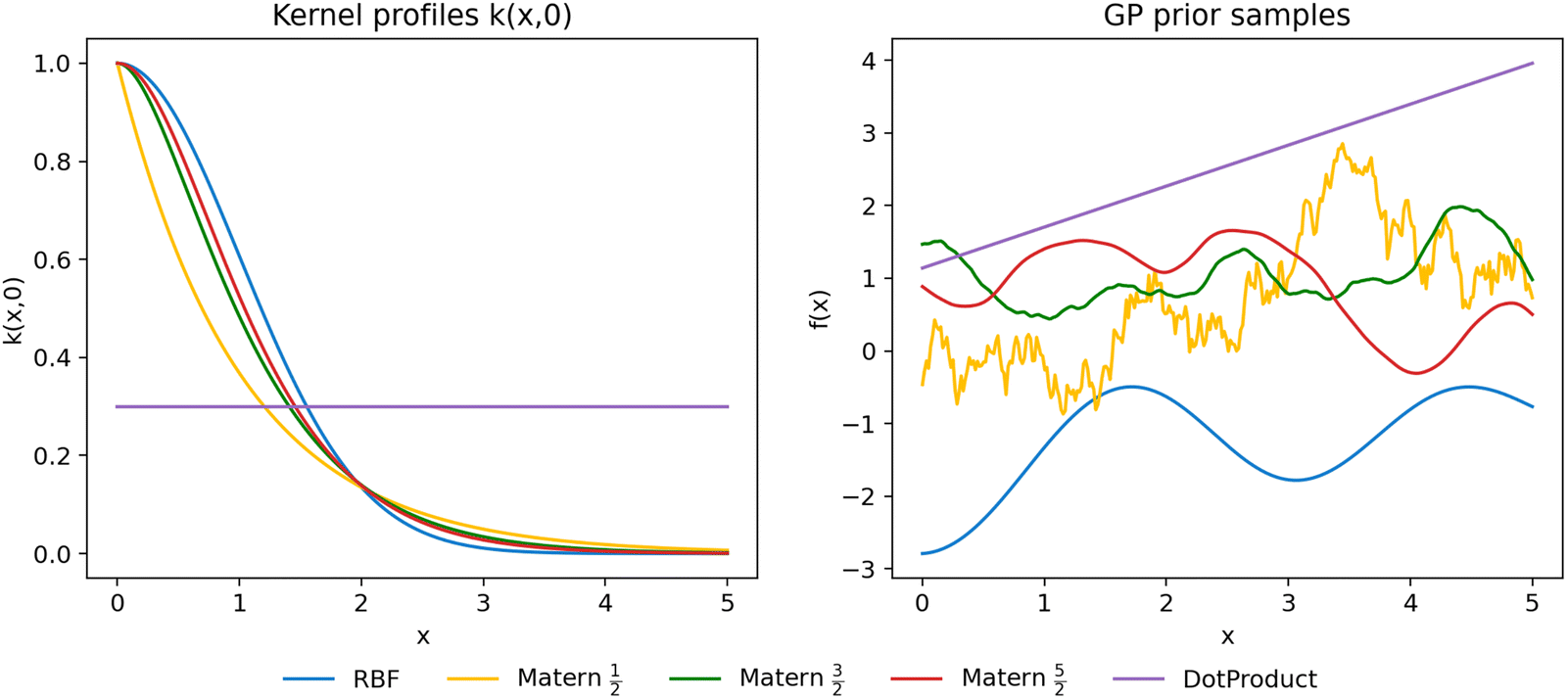 is the expected value over distribution of functions modeled by the GP. Conceptually, the mean function can be seen as the ‘average’ shape of the function—the mean value of n samples from the GP evaluated at x for n → +∞ would be m(x)—while the covariance function governs the covariance between any two function values computed at the corresponding inputs.36 In other words, the kernel characterizes similarity between data points, by mapping them to a high-dimensional feature space to better reflect the distances between data points and their similarities.37In GP regression, the covariance function dictates the properties of the response functions that can be fitted.17 This allows incorporating prior assumptions about the function's smoothness, periodicity and overall behaviour through a careful choice of kernel. The most used class of kernels is the Matérn class.22 The smoothness of Matérn kernels can be adjusted by the parameter ν > 0, and samples from a GP using such a kernel are differentiable [υ − 1] times.17 The general equation of the Matérn kernel is the following:22,35