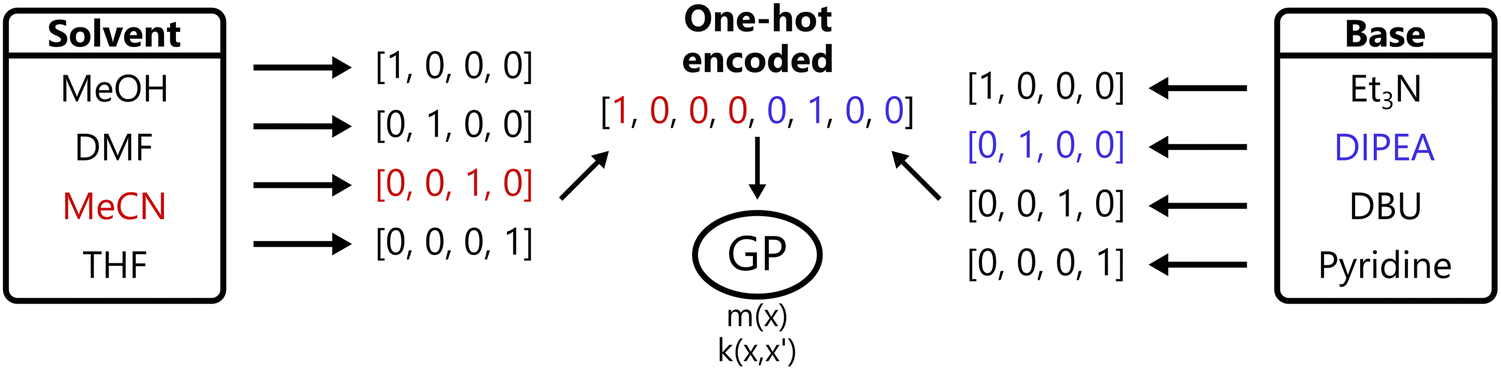 Another common approach in machine learning in general is to represent categorical inputs via one-hot encoding, transforming each categorical variable with k levels to a binary vector of length k. This converts categorical variables into a pseudo-continuous space, allowing them to be handled by standard kernels.45,46 This process is visualized in Fig. 5.