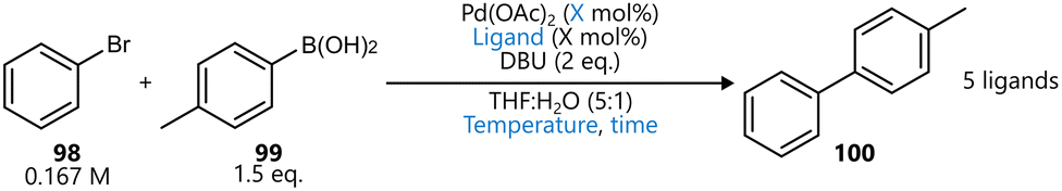 | Scheme 13 Suzuki–Miyaura cross-coupling optimized to demonstrate the ALaBO optimizer by Aldulaijan et al.53 ALaBO dynamically adjusts the acquisition function during optimization to shift from exploration towards a more exploitation-focused approach. Parameters defining the reaction space are highlighted in blue. | ||
