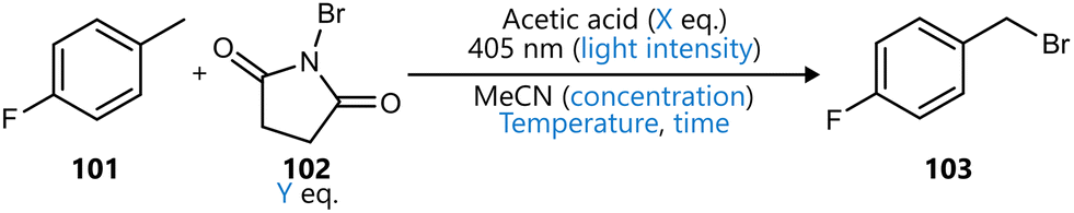 At this point, it is clear that BO frameworks are highly efficient in locating optima. However, their data-sparse nature often limits the broader interpretability of models, which is a key requirement for regulatory acceptance and process scale-up. In particular, quality-by-design (QbD) principles emphasize the need for robust, data-rich models to ensure long-term process control and reproducibility.104–106 In response to this need, Knoll et al. proposed a hybrid approach that uses BO to narrow down the search space prior to formal model building.107 This was demonstrated on a photochemical benzylic bromination (Scheme 14), where six variables were to be optimized with regards to maximizing STY, conversion and selectivity: equivalents of acetic acid, temperature, concentration of starting material, light intensity, residence time, and equivalents of N-bromo succinimide (NBS) 102. The BO campaign, employing the TS-EMO algorithm, required 42 experiments to identify a high-performing region within the broader search space. Subsequently, a DoE was carried out in this region—which was defined manually from the BO campaign—to construct a local response surface model. This strategy illustrates how BO can be effectively embedded within a broader process development pipeline, combining its strength in efficient search with the modelling needed for a QbD approach.