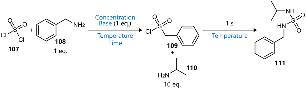 | Scheme 15 BO-optimized telescoped synthesis of asymmetrical sulfamides, reported by Sugisawa et al.132 Parameters defining the reaction space are highlighted in blue. | ||