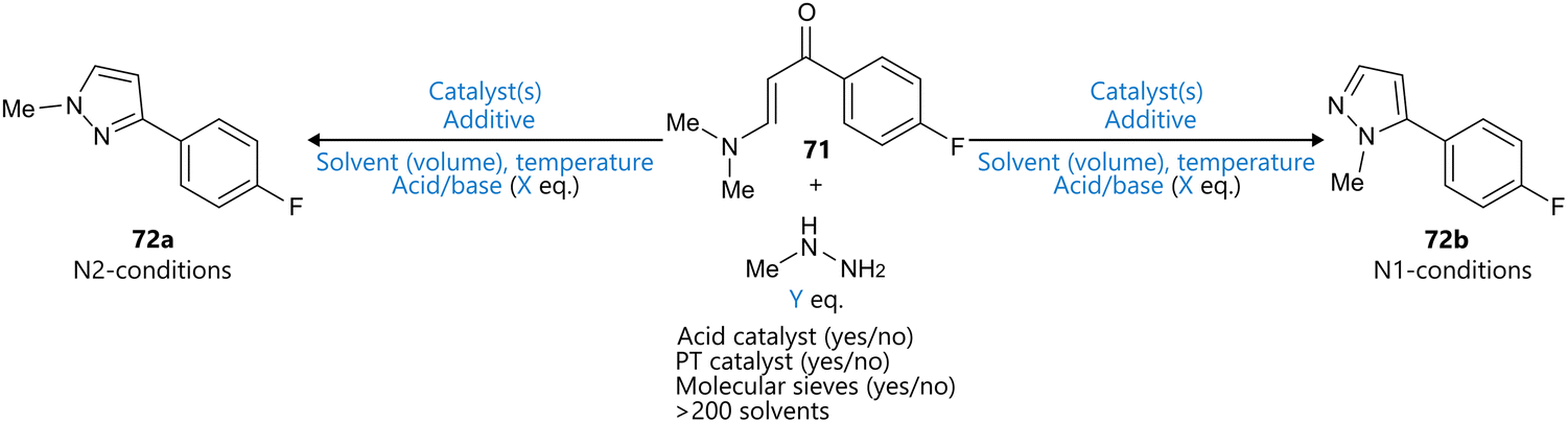 | Scheme 8 Knorr-pyrazole condensation to access methyl pyrazoles 72a reported by Dalton et al.98 BO was used to optimize for both N1- and N2-selective reaction conditions, targeting both yield and selectivity. Parameters defining the reaction space are highlighted in blue. | ||