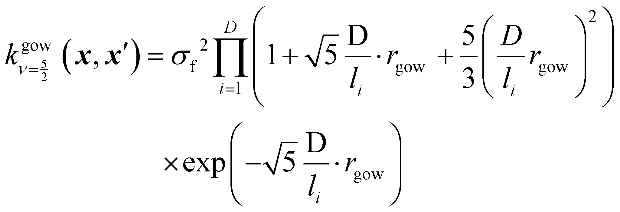 and 1 otherwise. This composite distance metric can then be put into the kernel, replacing the Euclidian distance r. For example, when applied to the Matérn kernel for the case where ν = 5/2, the mixed-variable kernel becomes:
