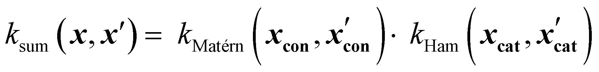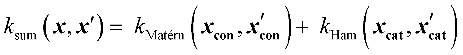The kernels discussed up to this point all exclusively deal with continuous variables. However, in many practical applications—especially chemical reaction optimization—the input space contains a mix of continuous, categorical, and even structurally encoded variables. Traditional distance-based kernels, using the scaled Euclidean distance metric r, may not effectively capture the mixed nature of these inputs. Several strategies have been developed to address this issue, the most important of which will be covered here, without delving into a detailed discussion, as this is outside the scope of this literature review.