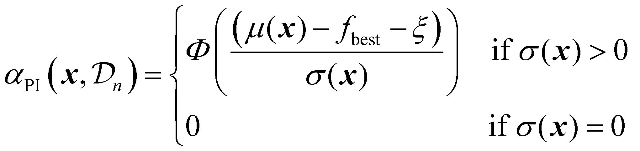The parameter ξ plays an important role here, similar to its role for the EI acquisition function. In the standard implementation of PI, with ξ set to zero, the acquisition function is biased towards exploitation. This can be mitigated by adjusting the value of ξ.18 A higher ξ lowers the probability of improvement by effectively increasing the threshold that a candidate must exceed, thereby encouraging exploration of regions with higher uncertainty.
