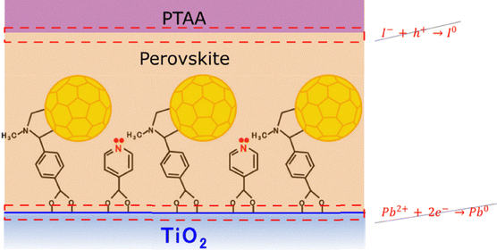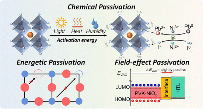 3.1.2. Interface modulation. This is one of the key aspects of improving the overall performance and stability of PSCs. This strategy can influence the charge transfer, recombination and the operational lifetime. Interface modulation refers to strategies like adding buffer layers at the perovskite/charge transport material interface, which act as defect passivation materials that reduce non-radiative recombination and enhance stability.224,225 In this context, adding adducts onto the surface of perovskite films can patch grain boundary cracks and passivate interfacial defects.226 Lewis base passivation can reduce nonradiative electron–hole recombination and enhance photoluminescence lifetimes by nearly up to 2 µs.227 Interfacial recombination occurs due to poor contact or defect-rich interfaces. Strategies like employing self-assembled monolayers (SAMs) with high polarity can improve the band alignment and minimize the energy loss suppressing recombination and improving open-circuit voltage (Voc)228 and stability. Chemical surface treatments and interface modulation using hydrophobic or encapsulating materials have been shown to enhance the long-term stability of perovskite solar cells. For example,229 incorporating 2D perovskite materials into the perovskite layer improved moisture tolerance and stability without significantly compromising efficiency. Unfortunately, not all devices made using the previously mentioned strategies have been tested under real-world operating conditions, and most of them have been evaluated under simulated-laboratory conditions; additionally, most of the devices are less than 10 cm2 of area (lab cells).Recent studies have used self-assembled monolayers (SAMs) to enhance light stability and outdoor performance. Sekimoto et al.181 proposed the use of isonicotinic acid/C60 SAM between the electron transport layer and the perovskite. Long-term outdoor stability was tested in Osaka, Japan, on encapsulated cells under open-circuit conditions for six months, with a cumulative light exposure of 774 kWh m−2. The results showed that the unpassivated TiO2 surface reduced thermal stability, whereas the cell with the modified interlayer, with an ITO/ATO/c-TiO2/mp-TiO2/C60SAM + isonicotinic acid/perovskite/BABr/PTAA/Au configuration, exhibited an almost unchanged PCE and improved durability against light and heat, with an estimated T100 of approximately 4032 hours. The origin of such improvement lies in the interlayer suppressing the deleterious cathode reaction, Pb2+ + 2e− → Pb0, at the ETL/perovskite interface, which in turn also suppresses the detrimental anode reaction, I− + h+ → I0, at the opposite HTL/perovskite interface. Such reactions ultimately originate from the volatility of the MA cation used in the triple-cation composition studied in this work. Loss of organic cations and iodine upon exposure to white light is known to take place in MA-rich compositions, being less of an issue when MA is replaced by FA or I by Br.230 This leaves PbI2 as a byproduct that can further undergo photolysis, yielding Pb0 by the previously shown reaction thanks to the availability of photogenerated electrons.231 The interface treatment with isonicotinic acid improved the electron extraction at the ETL/perovskite interface, both favoring performance and stability by effectively reducing the availability of “free” photogenerated electrons to reduce Pb2+. This approach hence directly confronts the issue of light instability, thus yielding resilient outdoor performance despite light-induced permeation of iodine into the HTL taking place. Interlayers of potassium pyrophosphates have also been used to improve the performance of semi-transparent perovskite solar cells. In a recent study,232 interface passivation (SnO2/perovskite) was performed by bonding potassium pyrophosphate (KPP) to the SnO2 surface, enabled by the coordination of Sn via Sn–O linkages with the pyrophosphate group (P2O74−).233 The compound was able to passivate undercoordinated atom sites, allowing a higher proportion of Sn4+ which is beneficial for the optoelectronic properties.234 The Sn2+ counterpart instead corresponds to Sn dangling bonds due to oxygen vacancies and produces non radiative recombination at the SnO2/perovskite interface given that a trap state within the bandgap is formed.234 The proposed strategy in turn yielded perovskite films with enhanced crystallinity, which as mentioned before can tackle the instability caused by electrical bias due to reduced grain boundaries. The authors also claimed enhanced thermal stability since they found less PbI2 in their perovskite films following thermal annealing. However, since they employed a double-cation composition (mostly FA with some MA) and PbI2 is not amongst the decomposition products of FAPbI3 in the temperature range of outdoor operation (e.g., 70–75 °C in summer), the lower presence of PbI2 could be ascribed to the same phenomenon highlighted in the previous approach, where in this case the prevention of charge trapping at the relevant interface hinders photolysis of photogenerated PbI2 by the light-induced loss of MA cations. Ultimately this enabled an estimated T80 of 1104 hours of outdoor exposition in South Korea for devices with an ITO/SnO2/perovskite/Spiro-OMeTAD/Au configuration. The perovskite/HTL interface in more mainstream n–i–p configuration has also been modified. For instance, deposition of a delaminated 2D Ti3C2 MXene layer intercalated with 3-phosphonopropionic acid (H3pp) onto a quadruple-cation perovskite film has demonstrated to downshift both surface work function and valence band of the perovskite film, allowing enhanced hole-extraction at the interface. Furthermore, it enabled a 10-fold and 1000-fold decrease in the density of shallow and deep interface trap states, respectively.235 Ti3C2 typically displays Ti outer layers functionalized with O and OH groups that allow an electrostatic interaction with