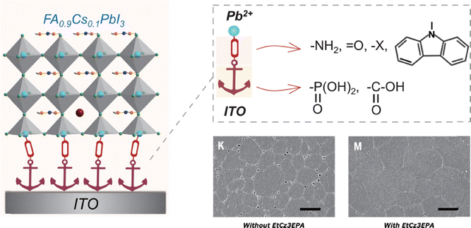 Fei et al.93 modified the buried ITO/PTAA/perovskite interface by adding an aromatic phosphonic acid, [2-(9-ethyl-9H-carbazol-3-yl)ethyl]phosphonic acid (EtCz3EPA). At such interface, mainly three types of defects are present following fabrication: Ii− (type I), Ii+ (type II) and a defect related to the formation of an amorphous perovskite region (type III) stemming from phase segregation.52 The density of all such defects increases following illumination during operation due to the UV region of the spectrum. Type II defects increased due to accelerated I-migration upon illumination, and since trapping of photogenerated electrons is possible by such defects excess holes are created which trigger A-cation migration and phase segregation.241 A weak anchoring between the perovskite and the ITO/PTAA substrate was identified as the main cause for this inadequate evolution under illumination, and hence EtCz3EPA was introduced as an interface layer capable of anchoring both ITO and perovskite at opposite ends. The –COOH and –PO(OH)2 groups of the molecule could link to the –OH groups of ITO, while the –NH–,