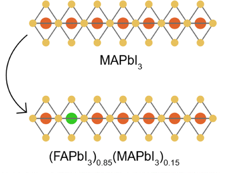 N double bond in FA+ due to the contribution of the conjugated π bond and protonated FA+ that hampers deprotonation.191 Additionally, FA+ displays low polarity and orientational mobility, which can increase the activation energy of ion migration for enhanced stability.192In this context, mixed- and triple-cation perovskite compositions have been tested extensively, aiming to synergize the benefits from different cations in the material and displaying promising outdoor stability from the early days.83,193–195 Compositions with mixed A-cations, offer a straight-forward way to achieve this synergy and tune the Goldschmidt tolerance factor, an empirical index used to predict the preferentially formed structure which is important to promote the formation of photoactive α-perovskite phases.90 In this sense, combining FA with a smaller cation, namely MA or Cs, allowed the benefits of FA while bringing down the tolerance factor into a suitable range to promote the formation of α-phase. Indeed, already in 2015 a mixed composition of (FAPbI3)0.85(MAPbI3)0.15 enabled an optimized PCE going from 13.5 to 17.3% in a FTO/TiO2/perovskite/Spiro-OMeTAD/Au configuration.193 The same perovskite composition enabled cells showing a T80 of 846 h upon exposure in Spain following the ISOS-O-2 protocol.196 This approach is highly compatible with scalable deposition methods like blade coating and slot-die coating, since perovskite films fabrication relies on solution-based precursors, which can be adapted to large-area deposition systems.197 However, scalability challenges include ensuring uniformity of cation distribution over large areas, as variations in precursor stoichiometry can lead to phase segregation or inconsistent film quality.198 Precise control of precursor mixing and environmental deposition parameters, such as temperature and humidity, is critical to maintain reproducibility in high-throughput settings. It is important to note that, given the pioneering nature of the work, although the A-site alloying directly addressed the intrinsic thermodynamic instability of FAPbI3, intrinsic temperature instability during operation remained an issue. In several of the devices, following evaluation, the presence of iodine (I) in the Spiro-OMeTAD layer was noted, clearly indicating ion migration. This is expected as no direct attempt of “ion fixation” was pursued, which could be aggravating for stability given that the authors identified I− ions as the most likely mobile ones. This highlighted already in the early years the need to devise clever strategies to tackle intrinsic instabilities.