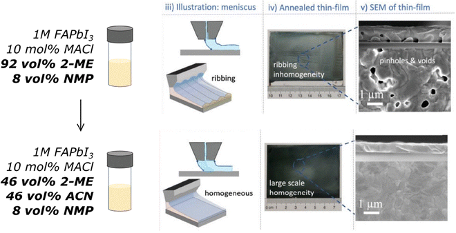 Accordingly, in the following years this A-site cation tuning has been complemented with several other strategies. Finely tuning the solvent system employed in the perovskite precursors along with the deposition technique has proven to be a suitable approach to modify the bulk of the layer and improve performance in outdoor conditions. Both aspects go hand in hand since they determine the crystallization kinetics of the perovskite film. The solvents employed in perovskite precursor solutions often have either a low boiling point and high saturated vapor pressures, e.g., 2-methoxyethanol (2-ME), or a high boiling point and low saturated vapor pressures, e.g. N,N-dimethylformamide (DMF) and N-methyl-2-pyrrolidone (NMP). The former displays a weaker lead Pb2+ coordination, in agreement with its low donor number and low polarity,189,199 and hence can promote rapid nucleation as solute precipitation rapidly becomes more energetically favored upon solvent removal. When uncontrolled, this could restrict grain growth and crystallinity,92 which is deleterious owing to the appearance of more grain boundaries that are known to have negative impacts on ion transport and perovskite decomposition over time, as has been reviewed in several works available in the literature.200–202 The latter, typically polar aprotic in nature,203 instead shows a high Pb2+ coordination ability, e.g., DMF coordinates Pb2+ via the Pb–O bond,204,205 thus exhibiting slow supersaturation due their low evaporation rates. This eventually limits the rate of nucleation, which can be exploited to compensate for the potentially harmful fast nucleation when using the previous solvents, but could compromise the control of the film uniformity, coverage and thickness over large areas.203 When processing via blade coating, the drawbacks of high boiling point-solvents have been overcome by meticulous meniscus control during coating. When aiming for high throughput in blade coating, the deposition falls in the Landau–Levich regime, where viscous forces and Marangoni flow of the solute influence the amount of solution transferred from the front meniscus to the substrate. This makes the uniformity of the coating highly susceptible to uncontrolled airflow, e.g., from the environment at the vicinity of the coating tool. This could stochastically alter the front meniscus at different positions, yielding inhomogeneous film thickness which has a direct effect in performance and stability. In view of this, and by using an NMP/DMF precursor whose high affinity towards lead allows slow nucleation leading to excellent crystallinity and grain size, Yoo et al. employed a high-velocity nitrogen stream directed towards the front of the meniscus during coating to induce an inwards contraction of it. This lowered the amount of precursor solution advancing towards the substrate homogeneously throughout the deposition front and accelerated drying of the wet film, enabling film thinning owing to the reduced duration of wet films. Consequently, an uniform and smooth film was achieved despite the high boiling point of the solvent system.92 In this way, encapsulated n–i–p minimodules with a FTO/SnO2/KCL/FAPbI3/PTABr/Spiro-OMeTAD/Au configuration showed an approximate T93 of 2000 h under outdoor operation conditions in China. As this approach focused on increasing the crystal quality of the perovskite film, the most important factor contributing to stable outdoor behavior was the reduction in grain boundaries. This directly tackles the resilience of the device against the combined effect of temperature and bias. Namely grain boundaries in perovskites are commonly rich in point defects, namely I− ions,206 which are highly mobile upon biasing or heating. Given the downward band bending in the device during operation, such accumulation is aggravated by further migration of ions in the vicinity of the boundary towards it, which can result in decomposition into PbI2 in presence of humidity118,207 or formation of non-photoactive δ-FAPbI3.208 Although not the main focus of the work, the surface treatment of the perovskite with PTABr also plays a role in stability, as it tackles the negative effect of possible humidity leaking into the encapsulated devices. PTA+ can be readily adsorbed via hydrogen or ionic bonds between its ammonium groups and the perovskite cages, while its hydrophobic phenyl groups prevents water-induced reactions at the vulnerable interface.209 Alternatively, the drawbacks of low boiling point solvents can be bridged by including small amounts of high boiling point lead-coordinating ones and smart ink design. Dagar et al.168 employed a combination of 2-ME with small amounts of NMP that compensates for the otherwise restricted grain growth promoted by the sole use of 2-ME by forming an intermediate adduct with the perovskite precursor materials (FAI·PbI2·NMP) that aids crystallization prior to the formation of the final FAPbI3 α-phase.210 Effectively, such adduct slows the overall crystallization, which in turn enhances grain growth and crystallinity. Upon deposition via slot-die coating, despite good crystal quality, ribbing effects were present, for which further addition of acetonitrile (ACN) as a low-lead-coordinating co-solvent211 was used. This caused the ink viscosity to decrease and led to an earlier onset of the formation of intermediate solvate phase owing to the low boiling point of ACN, which in turn removed the ribbing issues. This increased homogeneity translates to better phase purity of α-FAPbI3 perovskite and improved crystallinity, ultimately leading to encapsulated p–i–n lab cells with an ITO/Methoxy-substituted [2-(9H-carbazol-9-yl)ethyl]phosphonic acid (MeO-2PACz)/FAPbI3/LiF/C60/BCP/Cu configuration displaying a remarkable T80 of approximately 8760 h in Germany.168 Similarly to the strategy followed by Yoo et al., the mixed use of solvents here tackled the combined effect of temperature and bias given its fo