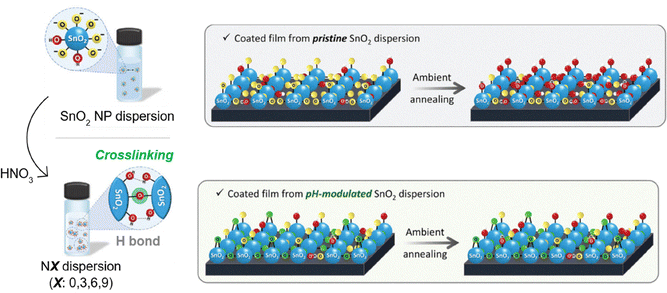In the case of n–i–p devices, a typical ETL is SnO2, which upon annealing during processing displays surface protonation resulting in the formation of –OH groups that act as interfacial electronic defects yielding non-radiative recombination-related losses.221 The formation is driven by the presence of two active sites on the surface of the as-deposited SnO2 films: a bridge oxygen and a 5-fold (under)coordinated Sn. The latter acts as a Lewis acid attracting water molecules from the air in the vicinity of the film, which readily dissociate and transfer a proton to the bridge oxygen.222 A clever strategy to mitigate this is using pH-induced agglomeration of SnO2 nanoparticles in the corresponding precursor used for deposition.91 Fine control to reduce the pH of the precursor by addition of HNO3 acid allows a controlled agglomeration of nanoparticles thanks to the appearance of oxo groups linking them guided by the equilibrium given by Sn–OH + OH− ↔ Sn–O− + H2O. The addition of HNO3 shifts the equilibrium in solution to the left, which owing to the reduced charge of colloidal nanoparticles allows them to come in close contact, hence aggregating by crosslinking between them upon the formation of oxo groups (Sn–O–Sn). This prevents protonation of oxygen during later annealing of the as-deposited SnO2 films, significantly lowering the amount of defective –OH groups appearing in the final film and hence decreasing the losses due to undesired recombination. The main consequence of this is an enhanced performance, which to some extent aids long term performance because larger losses can be somehow compensated by the higher initial performance. Additionally, oxo group crosslinking also allows the final SnO2 film to be more compact and display less pinholes, key to prevent defect-initialized permeation of moisture or oxygen.91 In this way, encapsulated n–i–p lab cells with an ITO/SnO2/perovskite/Spiro-OMeTAD/Au configuration maintained unchanged power output during 720 h hours of outdoor operation in South Korea. The pH-induced agglomeration strategy addresses the effect of both potential oxygen and moisture that may enter the device when encapsulation is not perfect, key in outdoor operation regions with tropical climate with a high humidity throughout the year that could trigger such permeation. In addition, it could potentially be integrated into existing coating workflows, since ultimately the key upgrade would be the addition of HNO3. However, the challenge lies in maintaining consistent pH control and nanoparticle dispersion in large-scale precursor solutions, as variations could lead to defects or reduce film quality.223