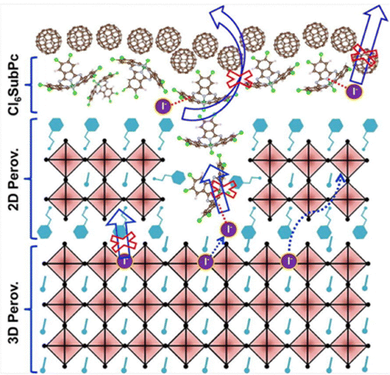 O, halide (–X) and carbazole groups could interact with the Pb2+ in the perovskite. Furthermore, the preferred in-plane orientation of the carbazole group allows better interaction of N with Pb2+ in the perovskite, indeed resulting in better anchoring compared to sole PTAA. Consequently, type-III defects (amorphous perovskite phase) were significantly suppressed and the increase of all defect types upon illumination was lowered, thus allowing reduced cation migration and phase segregation. This strategy hence directly bridged issues stemming from the coupled effects of temperature, electrical bias, and light, given the reduction of defects capable of trapping photogenerated carriers and whose migration is triggered during operation by heat and electric fields. The authors obtained outstanding outdoor stability results in Colorado (USA) with a T100 of 4872 hours for minimodules with an ITO/PTAA/FA0.9Cs0.1PbI3/C60/BCP/Cu configuration displaying an aperture area of 17.88 cm2. In view of industrial fabrication, this approach displays the same benefits and drawbacks as typical SAMS, namely compatibility with slot-die and spray coating216 and challenging uniformity over large areas.217 Alternatively, an ETL based on perylendiimide derivatives compared to Phenyl C61 Butyric Acid Methyl ester (PCBM) has proven to improve the stability of (ITO/PEDOT:PSS/MAPbI3/ETL/Ag) solar cell.242 In the study by Akbulatov et al., TOF-SIMS depth profiling revealed that, after device operation, a layer of AgI is formed at the ETL/Ag interface regardless of the type of ETL employed, although when using PCBM the proportion of such layer was higher. This is a result of MAPbI3 splitting into PbI2 and MAI (e.g., owing to photothermal decomposition upon operation),93 the latter one being a volatile compound capable of diffusing through the ETL, reach the back Ag electrode and corrode it to AgI.104,243,244 Although such process takes place for both types of ETL, in the case of the perylendiimde derivative, such diffusion only occurs through grain boundaries, which has a less negative effect on device performance over time. Additionally, MAI decomposition product was found to dimerize to (MAI)2, which should be intercalated in the ETL for diffusion to take place. DFT calculations showed this to be the main reason for increase stability, since such process can readily take place in PCBM while being heavily unfavorable for the perylendiimde derivate, which forms a very compact 3D network via van der Waals interactions. In this way, the proposed strategy bridged instabilities arising from the coupled effect of temperature and light, as harmful effects stemming from photothermal decomposition were mitigated. The fabricated lab cell scale devices were exposed to natural outdoor conditions in the Negev desert (Israel) to obtain a T80 of about 41 hours when using the perylendiimide derivatives compared to less than 5 hours for PCBM.242 Boron chloride subphthalocyanine (Cl6SubPc) has also been used to passivate the perovskite/fullerene ETL interface in inverted PSCs.245 In an ITO/Cu:NiOx/perovskite/ETL/C60:BCP/Ag device, Chen et al. found that N and B atoms from Cl6SubPc underwent strong chemical bonding with migrating ions from the perovskite, N allowing I− adsorption (more than 20 times stronger compared to bare C60 based on DFT and molecular dynamics simulations), key to prevent metal electrode corrosion upon operation, and B enabling electron transfer with both perovskite and C60.246 Furthermore, Cl ions from Cl6SubPc display higher binding energy towards Pb compared to bare C60, hence allowing stronger linking between perovskite and ETL. This resulted in effective inhibition of the halide ion migration at the perovskite/ETL interface, directly mitigating temperature and bias effects, e.g., suppression of electrode corrosion as the rate of corroding migrating ions reaching it is lower. Synergistically, the enhanced interface linkage favors charge transport, i.e., aiding the issue of charge accumulation at the interfaces whose deleterious effect has been previously described and related to light exposure. Consequently, the outdoor testing results in China showed a T87 of 1728 hours under ISOS-O-1 for lab cells. The use of specific materials like perylendiimide derivatives and CL6SubPc would still be highly compatible with solution processing at large scale, however, their scalability is limited by their synthesis complexity and cost, which may require highly specialized production facilities.247