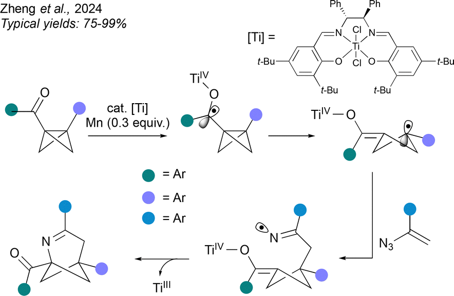 An alternative strategy to achieve a formal (3+2) cycloaddition firstly generates a radical from the BCB, as demonstrated by Zheng et al. (Fig. 10).48 Here, a TiIII catalyst triggers reductive ring-opening of the BCB via a ketyl radical anion, leading to an enolate-cyclobutyl radical. The radical is then trapped by addition to a vinyl azide with loss of N2, and the resulting iminyl radical undergoes cyclisation by addition to the TiIV enolate, a process that ejects and regenerates the TiIII catalyst. As before, this method accommodates a range of aromatic bridge substituents, and the bridgehead substituents are again an aromatic ring and a carbonyl. However in contrast to the above methods, the heteroatom is introduced on the side of the BCHep closest to the carbonyl substituent.