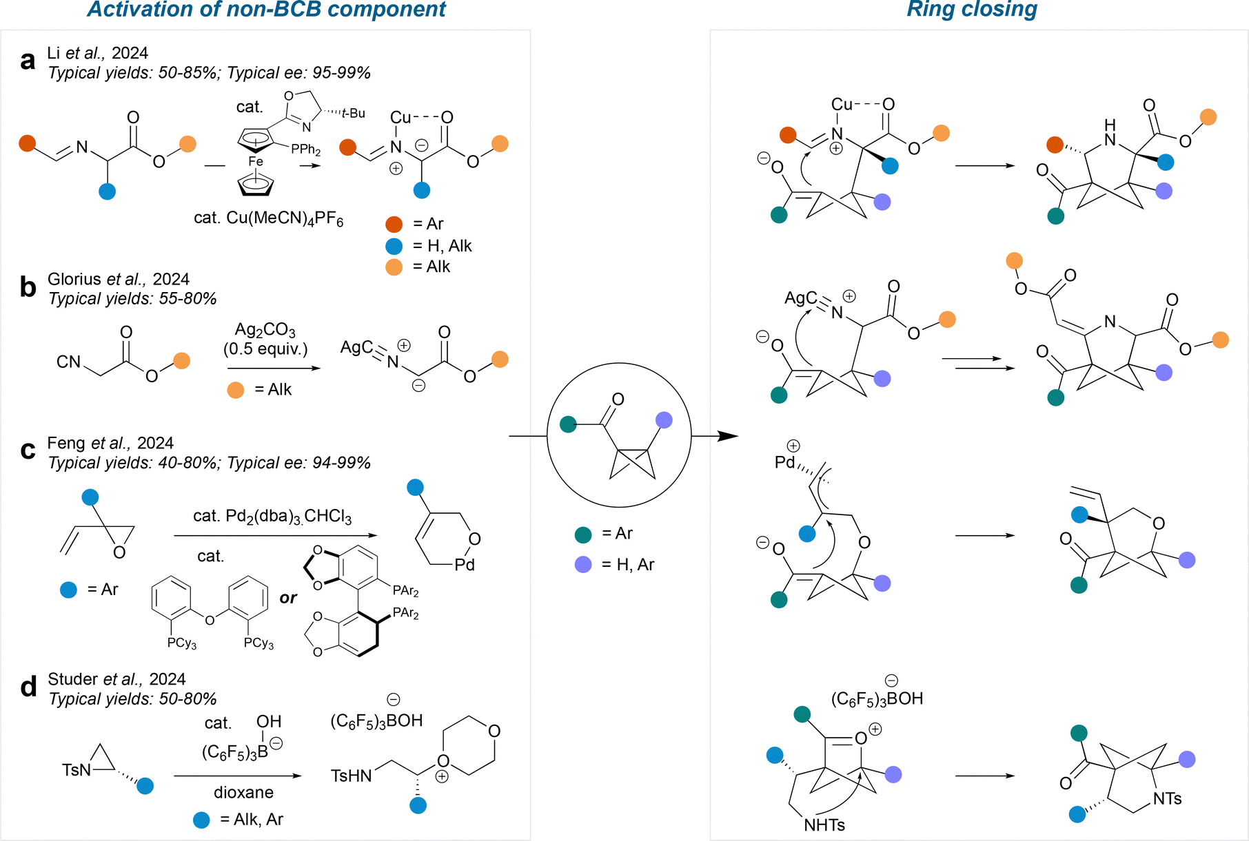In an alternative method by Feng et al.,51 a Pd catalyst facilitates an epoxide ring-opening by forming a π-allyl group, leaving the alkoxy group free to attack the BCB. The resulting enolate can close onto either side of the π-allyl system and the regioselectivity is controlled by the ligand chosen for the Pd catalyst. The bridge substituents are always a vinyl and aryl in the 4-position and the bridgehead substituents are always a ketone on one side and an aryl or hydrogen on the other side. The use of chiral phosphine ligands enables the synthesis of enantioenriched 2-oxaBCHeps.