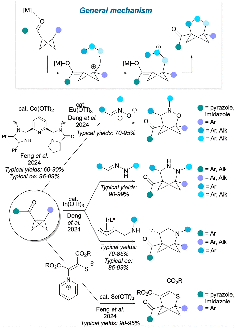 An alternative way to carry out a polar cycloaddition, shown in Fig. 12, is to activate the BCB with a Lewis acid, which promotes BCB fragmentation to an enolate-cyclobutyl cation. The nucleophilic part of an ambiphilic reaction partner then captures the cation, and finally the enolate reacts with the electrophilic centre of the reaction partner to close the 3-atom bridge. As these reactions rely on BCB activation, they inevitably feature a carbonyl group on one of the BCB bridgehead positions (which can coordinate to a Lewis acid) and an aryl group on the other bridgehead position (which can stabilise the intermediate carbocation). Examples include the method by Deng et al.53 which uses Eu(OTf)3 to facilitate reaction of a nitrone with the BCB, providing access to 2-oxa-3-azaBCHeps. This method has also been rendered asymmetric by Feng and co-workers using a chiral cobalt catalyst.54 In another method by the Deng group,55 In(OTf)3 catalyses the formal cycloaddition of hydrazones, leading to 2,3-diaza-BCHeps, or the stepwise addition of amine-substituted π-allylindium species, leading to 2-azaBCHeps; enantioenriched products can also be synthesised if a chiral iridium catalyst is also used. As before, these methods feature mainly aryl and carbonyl bridgehead substituents on the HBCHep product, while a range of mainly aryl substituents are available for the bridge positions. The Feng group reported a related method56 using Sc(OTf)3 as catalyst to effect the addition of 1,4-zwitterionic pyridinium thiolates, affording thiabicyclo[3.1.1]heptenes. This method produces compounds with similar aryl and carbonyl substituents on the bridgehead positions, but this time the bridge substituents are esters.