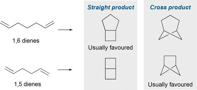 A complementary method described by Kim et al.59 (Fig. 14b) circumvents the need for carbonyls on the three-atom bridge by including a sidechain on the smaller bridge that can stabilise a positive charge, allowing the reaction to proceed in a stepwise manner via Prins-type cyclisation. This produces BCHeps with no substituents on the larger bridge and with esters on the bridgehead positions, which would be useful for further functionalisation. However the diarylvinyl group, which is necessary for reactivity, is retained on the cyclobutane bridge. This method could certainly become more applicable should the diaryl part prove amenable to further functionalisation, or if other, more medicinally relevant groups could be installed at this position.