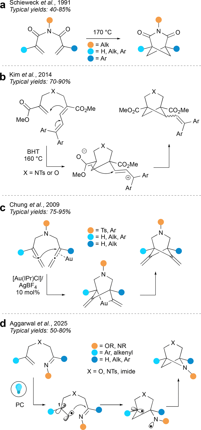 In one of the earliest syntheses of aza-BCHeps, Schieweck et al. described a thermal (2+2) cycloaddition of N-acryloyl acrylimides, decorated with various substituents, to generate 3-aza-BCHep diones (Fig. 14a).58 In this reaction, one of the bridgehead substituents is an aryl group, but the other can be aryl, alkyl or a hydrogen atom, while the nitrogen substituent can be aryl, alkyl or H. This method could therefore potentially provide access to a wide range of medicinally-relevant aza-BCHeps with varying substitution patterns, albeit with the limitation that carbonyls must be included on the bridge, which introduces potential issues with downstream imide stability.