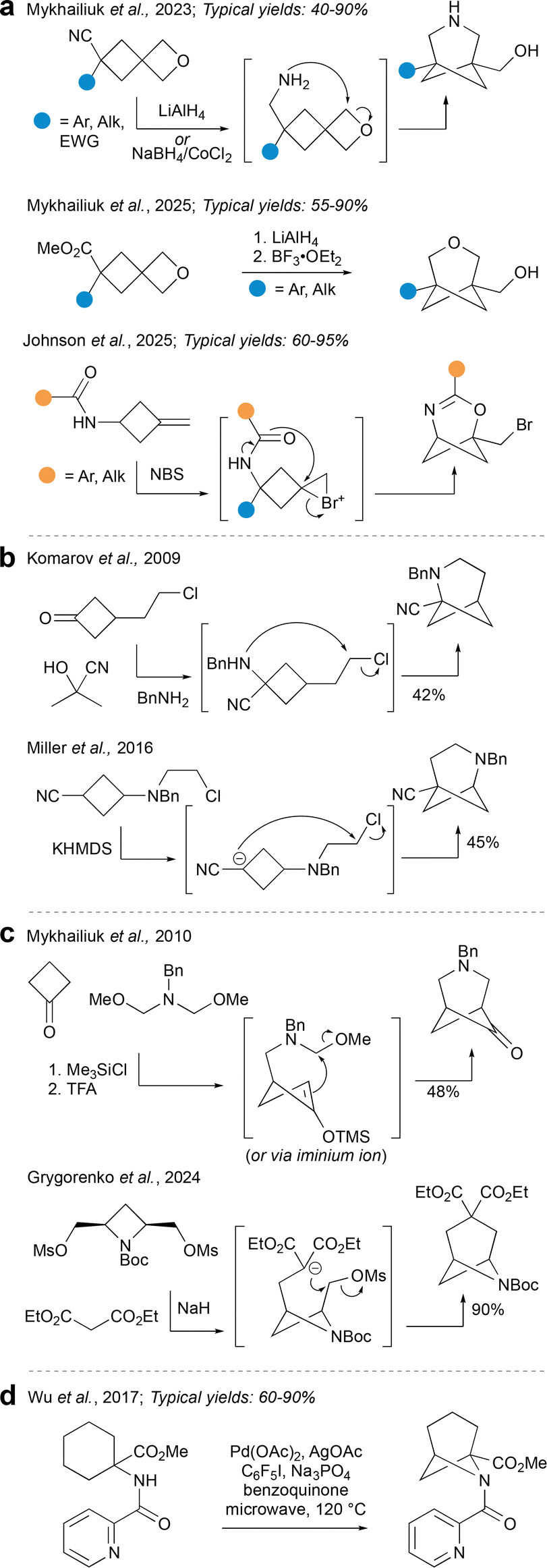 The next group of methods (shown in Fig. 15b) also involves cyclobutane-containing starting materials, however these are not spirocyclic and the mode of ring-closure varies between methods; all furnish HBCHeps with the heteroatom in the 2-position. Komarov et al.64 report a Strecker-type cyclisation which forms a C–N bond to make 2-azaBCHeps. The cyclisation was only attempted with the substituents shown, however there are opportunities for further functionalisation on the nitrogen or nitrile. A similar method was reported by Miller et al.,65 but this time a C–C bond is formed last by deprotonation adjacent to the nitrile, then attack of the aza-enolate on the pendent chloride. This results in 2-aza-BCHeps with the bridgehead nitrile group at the other side, which similarly present opportunities for further functionalisation.