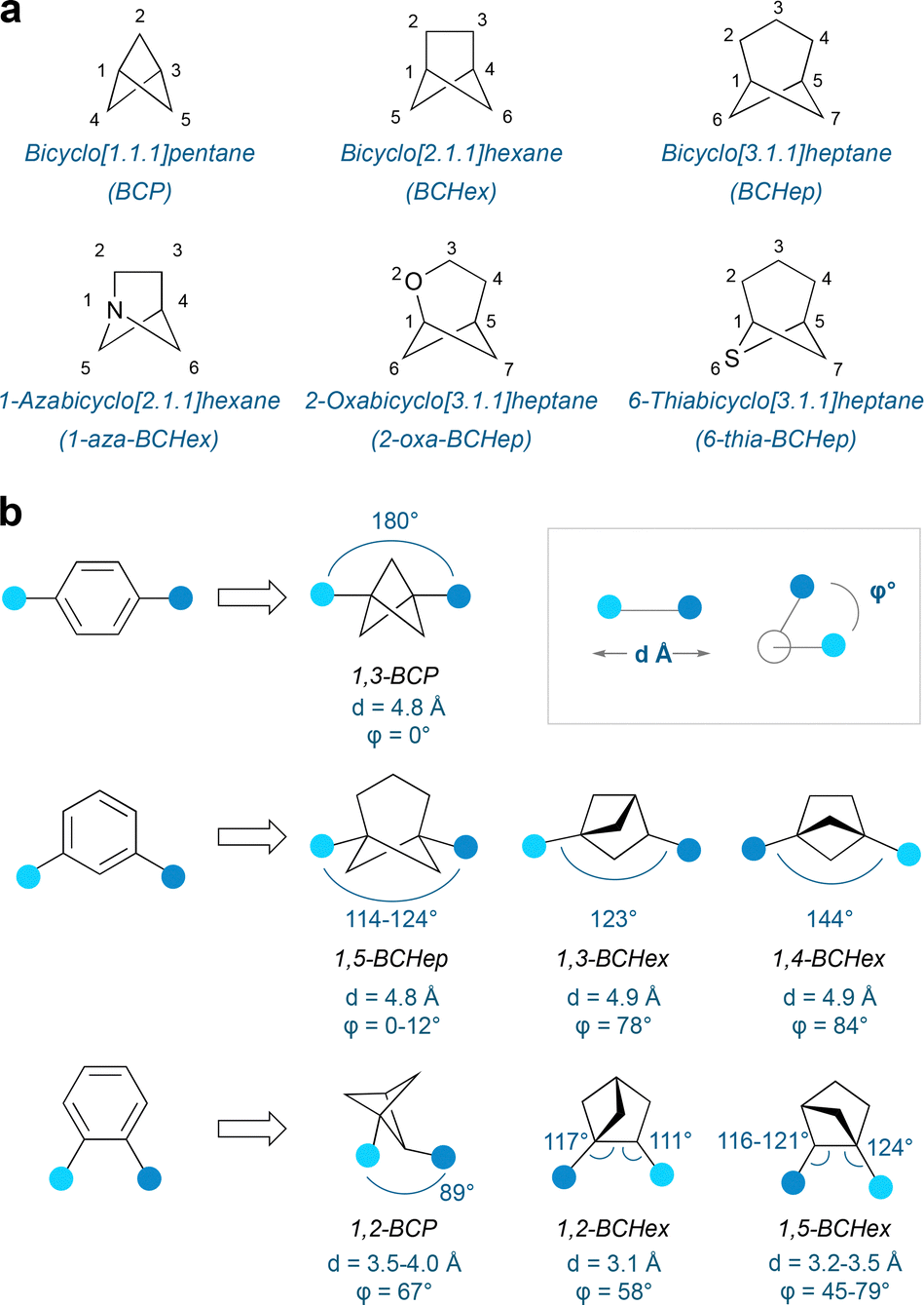 | Fig. 1 (a) Nomenclature of bicyclo[n.1.1]alkanes and heterobicyclo[n.1.1]alkanes. (b) Bicycloalkanes as bioisosteres: geometric considerations. | ||
