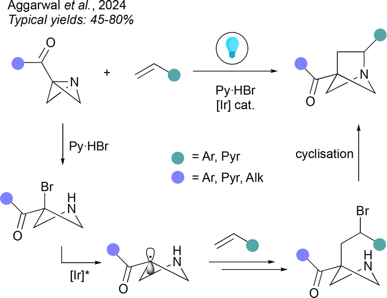 Aside from access to 2-heterobicyclo[2.1.1]hexanes, ionic cyclisations can also be applied to the synthesis of 1-hetero-BCHexs as recently demonstrated by Aggarwal and co-workers (Fig. 7).42 The method involved is a formal (2σ + 2π) cycloaddition onto a 1-azabicyclo[1.1.0]butane (1-aza-BCB). This multistep process is initiated by acid-promoted ring-opening of the aza-BCB by a bromide nucleophile to give a 3-bromoazetidine. This is followed by an iridum-photocatalysed atom transfer radical addition reaction, where SET from the excited state photocatalyst leads to a carbon-centred radical that undergoes addition to an alkene acceptor, followed by halogen atom transfer to reform a C–Br bond. Cyclisation of the resulting bromo-amine affords the 1-aza-BCHex.