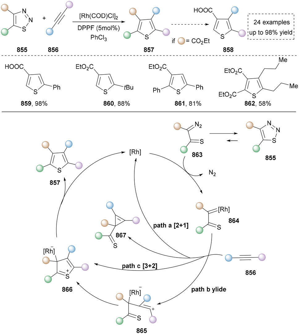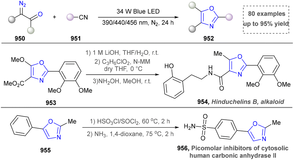 By designing different starting materials bearing N- and O-sources in the same molecule such as oximes, O-methyloximes, propargyl amides, phenolic amidines, and 2-aminophenols, the structural diversity of five-membered heteroarenes has been achieved (Fig. 2d).58–61 To further improve the synthetic efficiency, intermolecular synthesis from separate nitrogen and oxygen sources such as by using carboxylic acids and benzyl amines as staring materials has also been developed.62,63 Furthermore, the synthesis of N- and O-containing five-membered heteroarenes has also been developed by using starting materials bearing N and O sources such as α-azidochalcones and diazo compounds.64,65 In addition, the intermolecular synthesis by using separate nitrogen sources and sulfur sources has been reported.66–68
