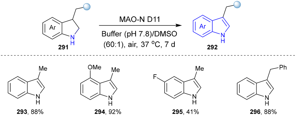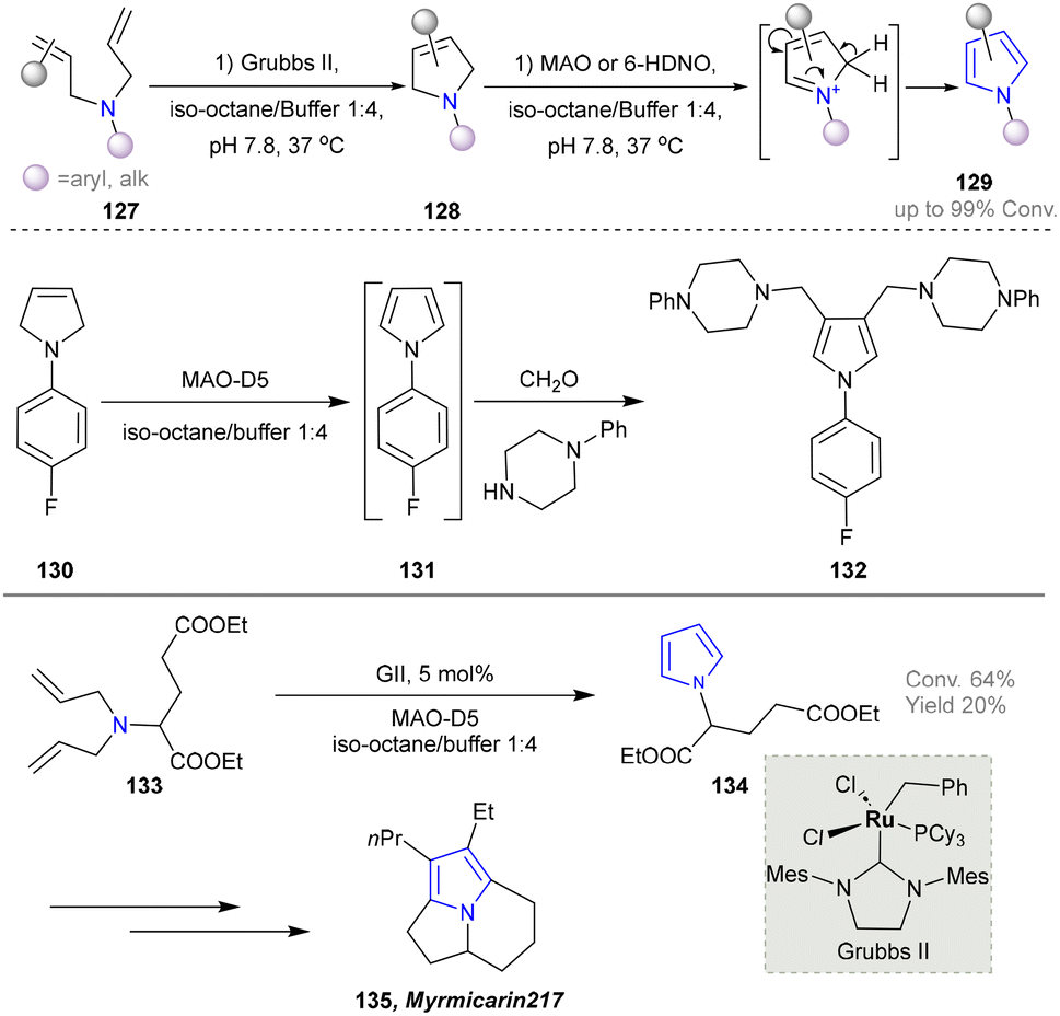 In 2017, the Castagnolo group reported that pyrrolines can be efficiently converted into pyrroles through the aromatization activity of MAO-N or 6-HDNO whole-cell biocatalysts under mild conditions. Among them, the variant MAO-D5 catalysed the aromatization of various N-aryl- and N-alkyl-3-pyrrolines (128) into the corresponding pyrroles (129). Afterwards, a one-pot chemoenzymatic cascade process combining ring-closing metathesis (RCM) reactions with the MAO-N enzymes was established to realize the sustainable production of pyrroles from diallyl-amines/anilines (Scheme 12).43 The MAO-Mannich chemoenzymatic methodology could be applied to synthesize the antitubercular pyrrole (132).120–122 Additionally, the pyrrole precursor (134)112 of the natural alkaloid Myrmicarin 217 (135) was obtained by the RCM-MAO chemoenzymatic cascade from the diene (133).123