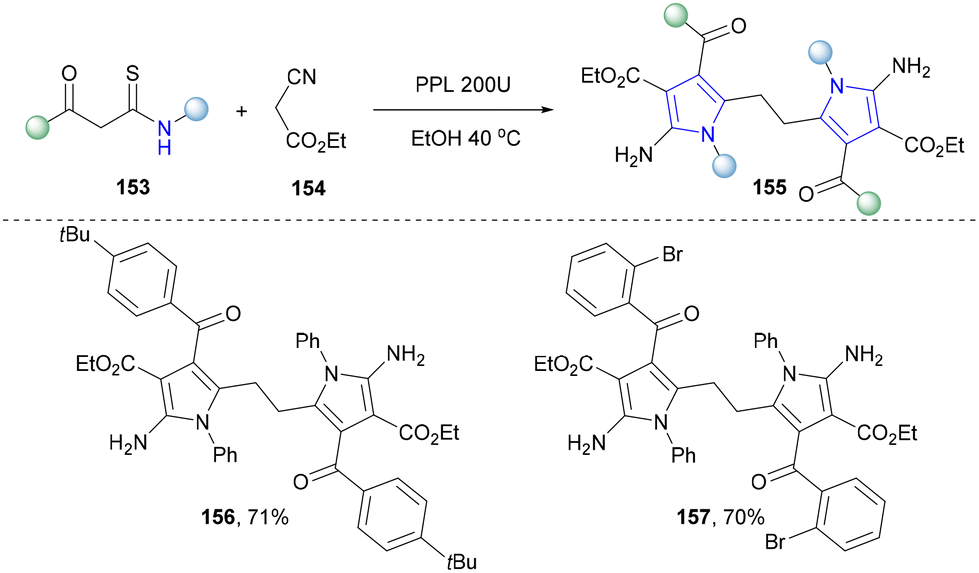 In 2023, an environmentally benign strategy has been developed by Wang's group to synthesize pyrrole disulfides (155), a fusion between pyrrole and disulfide functional groups, by porcine pancreatic lipase (PPL) in ethanol at 40 °C from β-ketothioamides (KTAs) 153 and ethyl cyanoacetate (Scheme 15).142 This strategy provided a significant improvement in the synthesis of pyrrole disulfides over the conventional synthesis methods by utilizing malodorous and toxic hydrogen sulfide gas or environmentally unfriendly reaction conditions,143,144 contributing to the advancement of environmentally friendly biocatalysis.