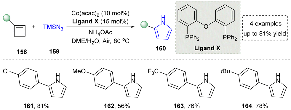 3.1.4 Atom editing for pyrrole construction. Skeletal editing has also emerged recently for the construction of pyrroles. In 2022, Wei's group disclosed the insertion of a nitrogen atom into aryl cycloalkenes through cobalt catalysis (Scheme 16).148 This transformation enabled the direct conversion of both electron-rich and electron-deficient arylcyclobutenes (161–164) into the corresponding aryl-substituted pyrroles via direct insertion of a nitrogen atom. Notably, the reaction proceeded under aqueous and open-air conditions, offering a simple protocol from readily available cyclobutenes. Even though the substrate scope needed further investigation, this emerging method provided a solution to access valuable pyrroles from different scaffolds.