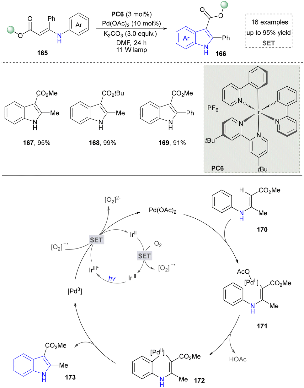 3.2.1 Photochemical synthesis of indoles. A new strategy that combined photooxidation and a palladium-catalysed system for high-energy indole synthesis was discovered by the Rueping group in 2014 (Scheme 17).156 3-Phenylamino-2-crotonates with various substituents were compatible with this strategy, and the corresponding substituted indole compounds are realised in high yields (167–169). The mechanistic study found that the superoxide anions formed by photooxidation catalysts in the absence of oxygen or in situ can act as an external oxidant in the presence of aerobic and photooxidation catalysts. Since only a small amount of oxidant was produced and consumed immediately, side reactions of the substrate or product could be avoided. Therefore, this method was very suitable for substrates that were sensitive to oxidants. Even though this pioneering work still required transition metal catalysts, this dual catalytic system avoided the use of typically external oxidants by using a catalytic amount of photooxidation catalysts.