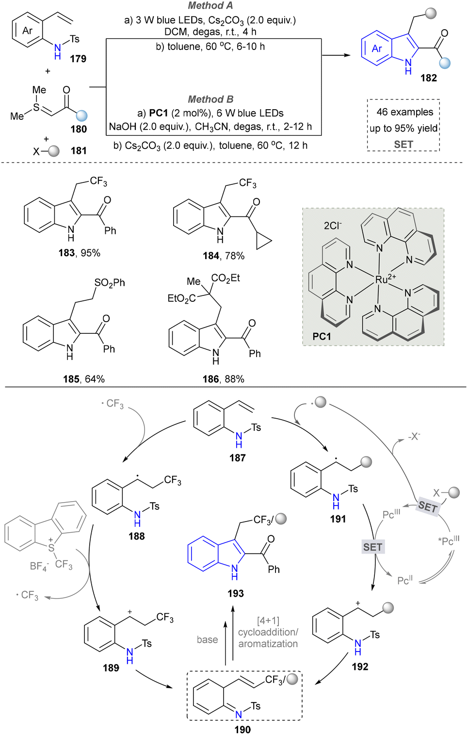 In 2017, the Xiao group presented a light-driven radical-mediated strategy for the in situ generation of azo-o-quinone methyl esters (190) from alkenyl aniline (187) and alkyl radical precursors, followed by alkali treatment of the cyclized products for efficient and convenient synthesis of high-energy indole (Scheme 19).158 This strategy enabled efficient multicomponent reactions of alkenyl anilines, halides and thionyl groups, and showed a wide substrate range and functional group tolerance (183–186). Later, the Wang group found the similar method to afford indoles using radical-mediated strategy.59 In the same year, the Kumar group also reported the synthesis of CF3-containing indoles by using Langlois’ reagent as the radical precursor.159 This work presented a novel and practical radical Smiles rearrangement initiated by a photo-oxidation-catalysed regioselective keto-alkyne amide coupling. In 2018, Li's team developed a visible-light-induced aerobic cross-coupling of glycine derivatives with indoles for efficient BIM synthesis, featuring mild conditions and good functional group tolerance.160