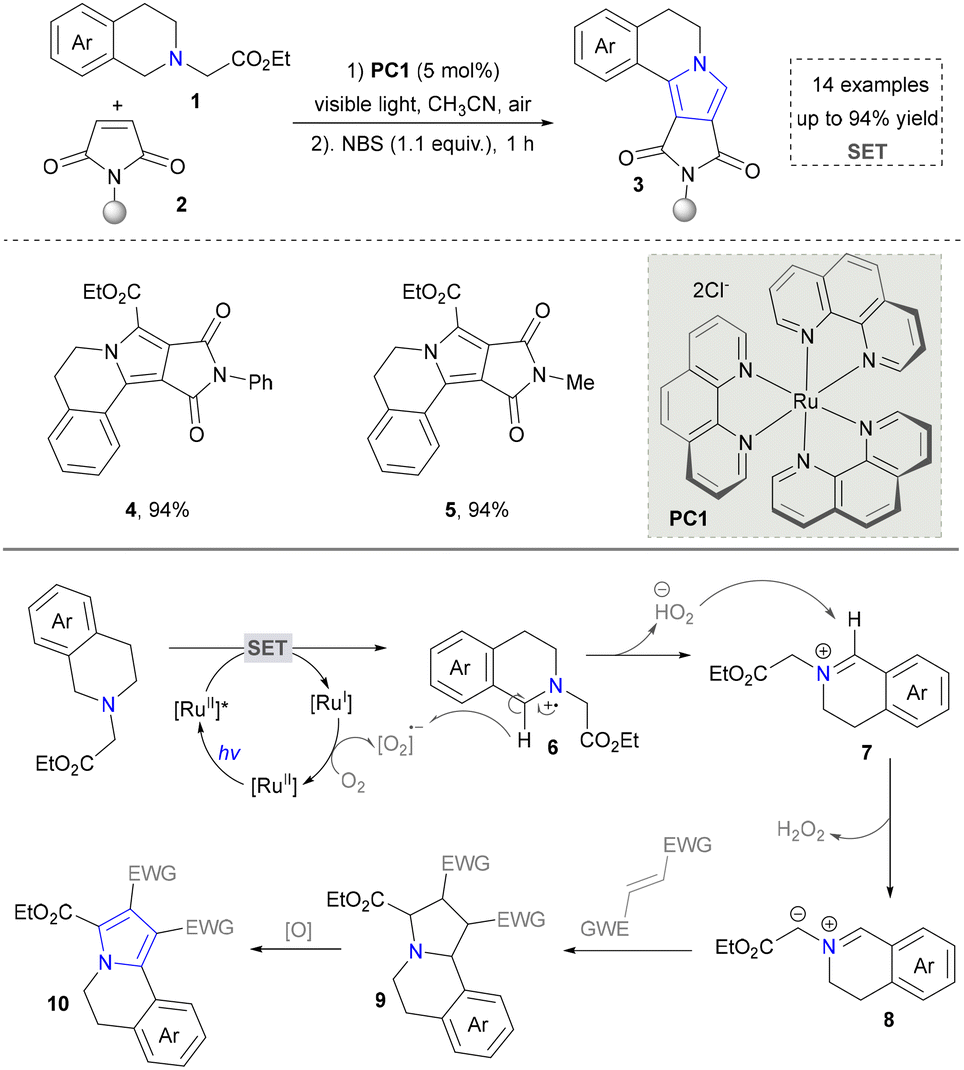 | | Scheme 1 Visible-light-induced oxidation/[3+2] cycloaddition/oxidative arylation sequence to obtain pyrroles. | |