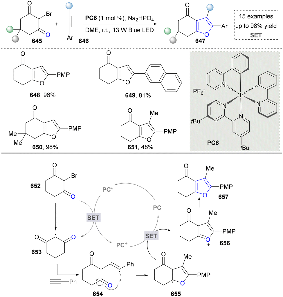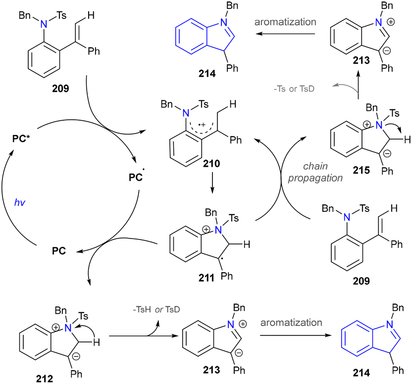 The proposed mechanism was depicted and the photoexcitation produced the highly oxidizing excited state of PC (Scheme 22). This was reductively quenched by the substrate (209), generating radical cationic species (210). The nitrogen atom in 210 then reacted with the alkene moiety intramolecularly, forming a cyclized radical cationic intermediate (211). A SET process between 211 and the acridine radical yielded zwitterionic intermediate (212) and regenerated an acridinium salt in the closed catalytic loop. The elimination of TsH or TsD from 212 formed another zwitterionic intermediate (213), which underwent aromatization to produce the desired indole product (214). Given the reaction's quantum yield of 1.77, a chain process occurred where 211 oxidized another molecule of 209 to produce 215, ultimately yielding the final product (214) via the same intermediate (213).