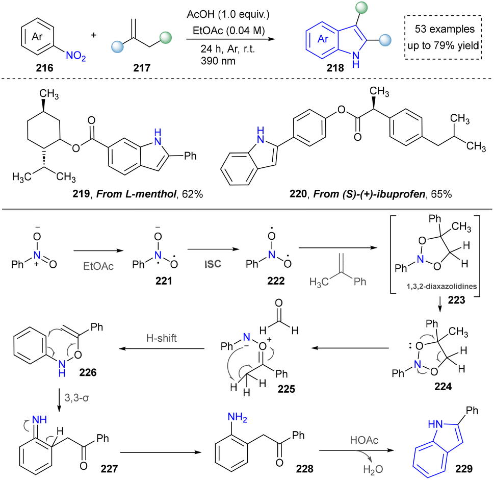 Cheap and commercially available nitroarenes have been ideal nitrogen sources for the construction of organic amines and N-containing heterocycles.166 The Shi group developed an environmentally friendly method for the synthesis of indoles by oxidative cleavage of olefins with nitro(hetero)aromatics in 2024 (Scheme 23).167 This strategy exploited the selective polar splitting of 1,3,2-dioxazolidine (223) to form carbonylimine intermediates (225) and N–O–C dipoles (226), and the novel reactivity of these dipoles, including the migration of carbonylimine to o-alkenyl hydroxylamine. Under the standard conditions, derivatives of bioactive molecules, such as L-menthol and S-(+)-ibuprofen (219, 220), were readily converted into indole-containing drug analogues using this photoinduced method, demonstrating the potential of this method in drug-oriented synthesis. This system exhibited notable tolerance toward ester and benzylic groups. However, the scope of late-stage functionalization of drug molecules remained relatively limited.