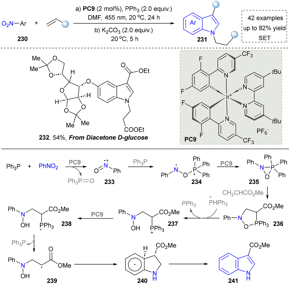 Similarly, the Studer group reported the cost-effective synthesis of indoles by photocatalysis. This strategy relied on a radical process for the activation of a nitro group and the annulation of nitroarenes and alkenes (Scheme 24).47 Diacetone-D-glucose, a natural product-derived compound, was readily converted into the corresponding indole derivative (232) through late-stage functionalization. This demonstrated the good tolerance of glucose compounds and acetal structures under standard conditions. Therefore, this photocatalytic system provided an efficient pathway for developing bioactive molecules containing indole skeletons. The key to success was the PPh3-mediated radical deoxygenation of nitroarenes. With the formation of nitrosoarene radical cations (234), they further reacted with various alkenes with electron-absorbing groups through the double C–H bond functionalization of nitro aromatics and alkenes at room temperature, and C3-functionalized indoles were quickly obtained. This work represents a significant shift in indole synthesis strategy, moving away from traditional reliance on alkynes and transition metals towards the use of more economical and stable alkene-based electrophiles. The method maintains high yields while demonstrating broad compatibility with a wide range of sensitive functional groups and complex bioactive scaffolds, thereby providing a new and practical approach for efficient indole construction.