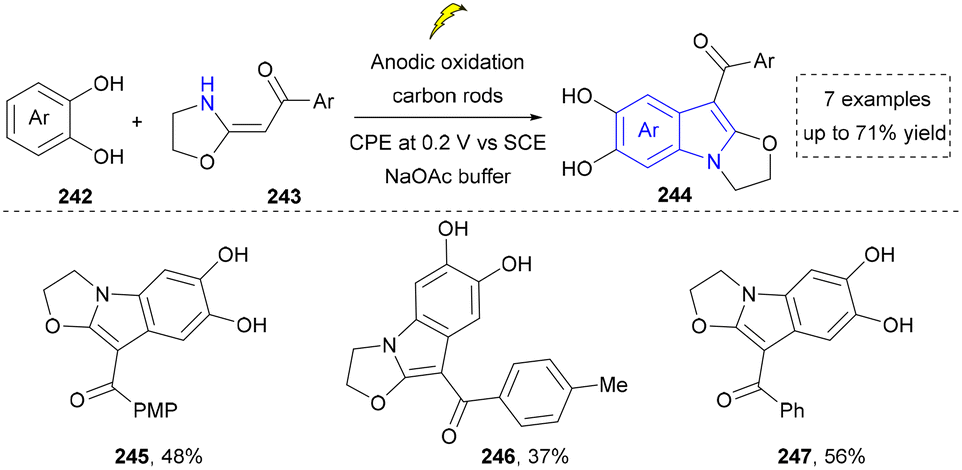 3.2.2 Electrochemical synthesis of indoles. As early as 2009, Zhong's team pioneered an electrochemical strategy for constructing fused indole derivatives through the annulation of catechol derivatives with α-oxacycloalkenone N,O-acetals (Scheme 25).170 This groundbreaking protocol established an environmentally benign approach to access structurally complex indole architectures under mild conditions. This methodology demonstrated remarkable efficiency in simultaneously installing reactive hydroxy and carbonyl functionalities within the fused heterocyclic system, a challenging feat for conventional synthetic approaches (245–247). The key advantages of this method lied in its protection-group-free nature and mild reaction conditions (room temperature, neutral buffer), although the regioselectivity was influenced by steric effects of substrate substituents.