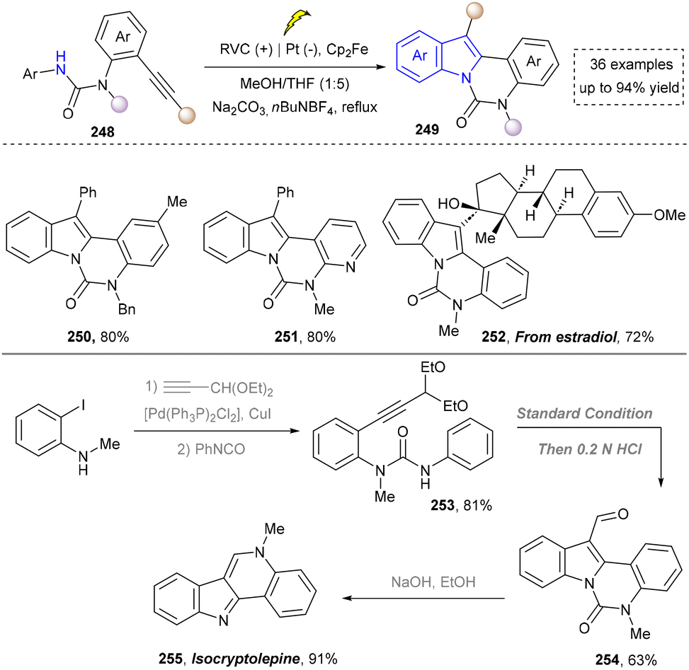 To further obtain diverse indoles, Xu and co-workers reported the electrochemical synthesis of highly functionalized indoles and azaindoles by C–H/N–H functionalization of (hetero)-arylamines using tethered alkynes (Scheme 26).171 The broad functional-group tolerance of method was evidenced by the preparation of indoles bearing diverse substituents and the more challenging task of constructing complex azaindoles (250, 251). This strategy was successfully applied to the late-stage modification of ethinyl estradiol derivative (252) under standard conditions, demonstrating the excellent compatibility with hydroxyl groups and chiral centers, underscoring the potential for the rapid synthesis of pharmaceutically active derivatives. In addition, this method required neither precious metals nor external oxidants. Finally, the utility of this method was highlighted by the concise total synthesis of isocryptolepine, which was prepared from advanced intermediate (254), requiring only minimal further manipulations.