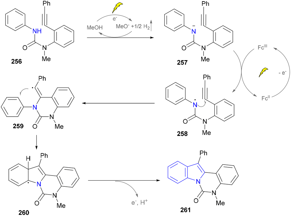 In their proposed mechanism, the electrochemical formation of (aza)indoles involved the anodic oxidation of [Cp2Fe] to [Cp2Fe+] and the cathodic reduction of methanol to methoxide (MeO−) and H2. MeO− deprotonated the substrate to form the corresponding anion (257), which underwent the single-electron transfer (SET) process with [Cp2Fe+] to generate nitrogen-centered radicals (258), which then underwent a rare 6-exo-dig cyclization reaction to form a vinyl radical (259). The further cyclization with the aryl ring produced a delocalized radical (260). Finally, the rearomatization of 260 via electron and proton elimination yielded the final product (261) (Scheme 27).